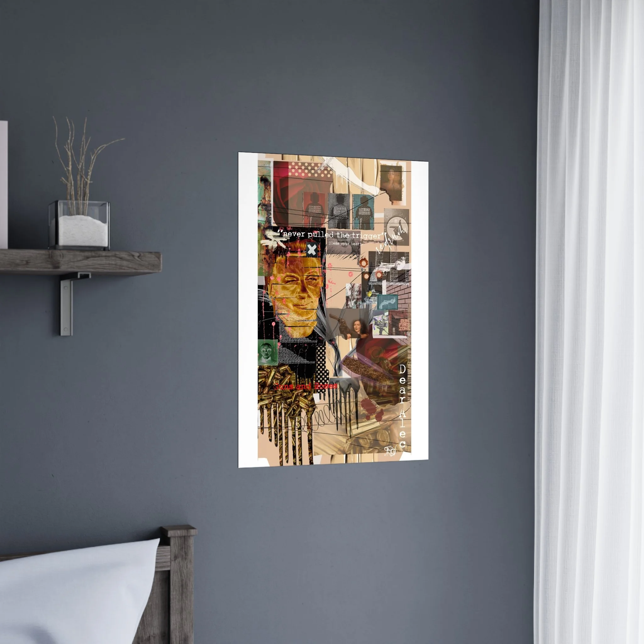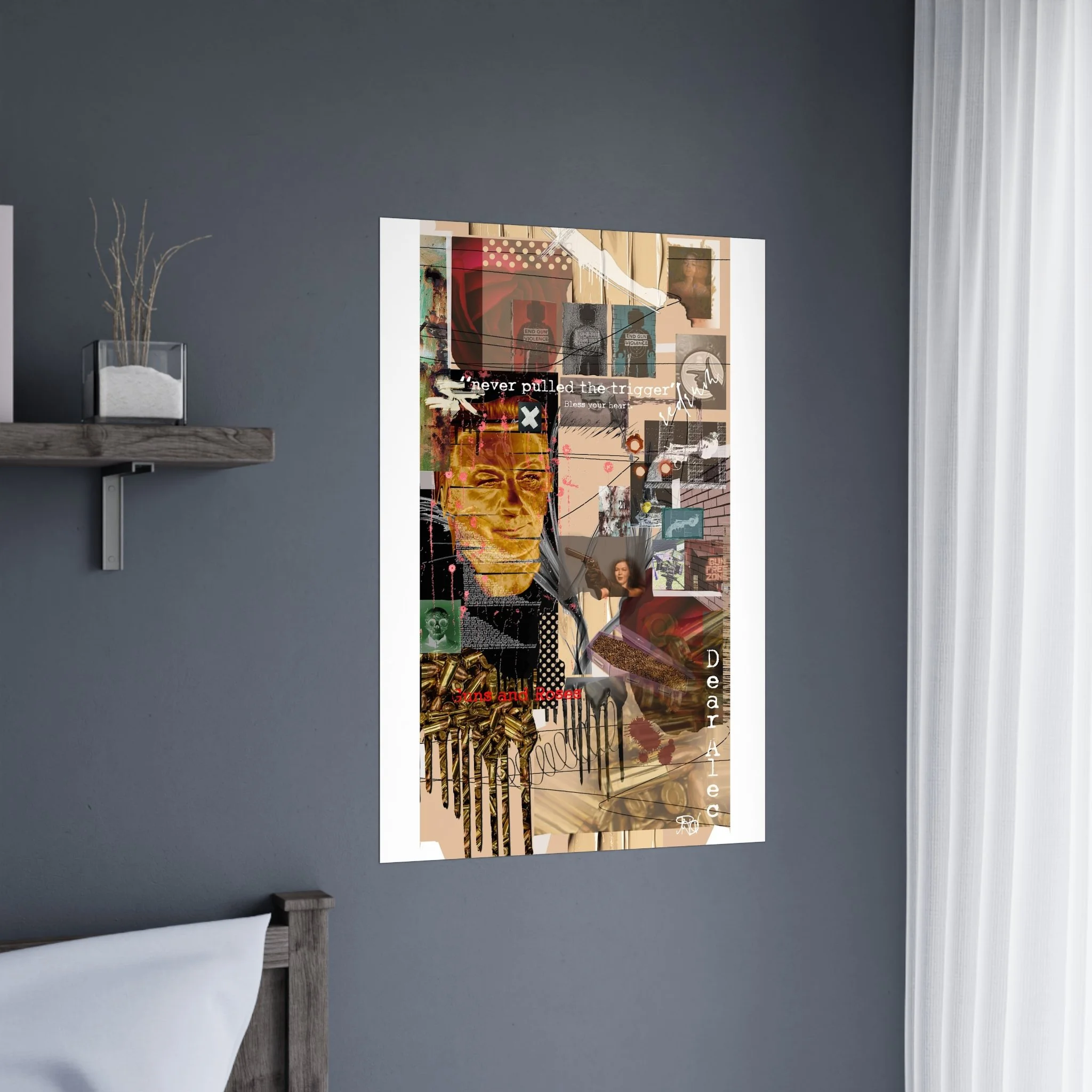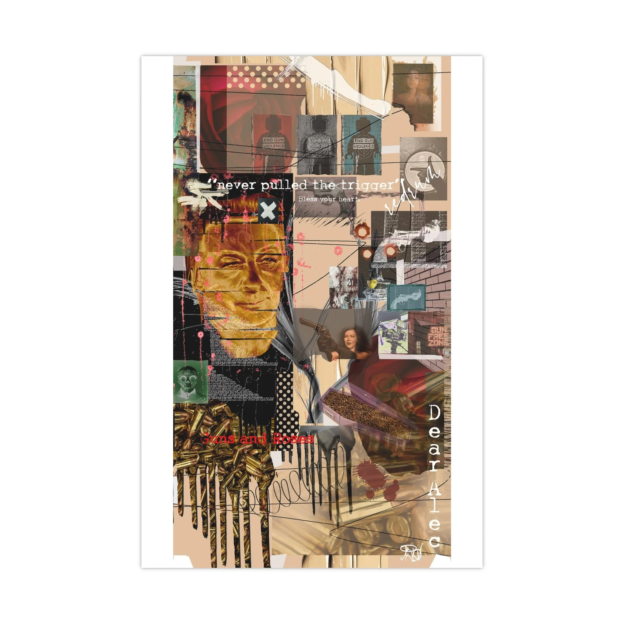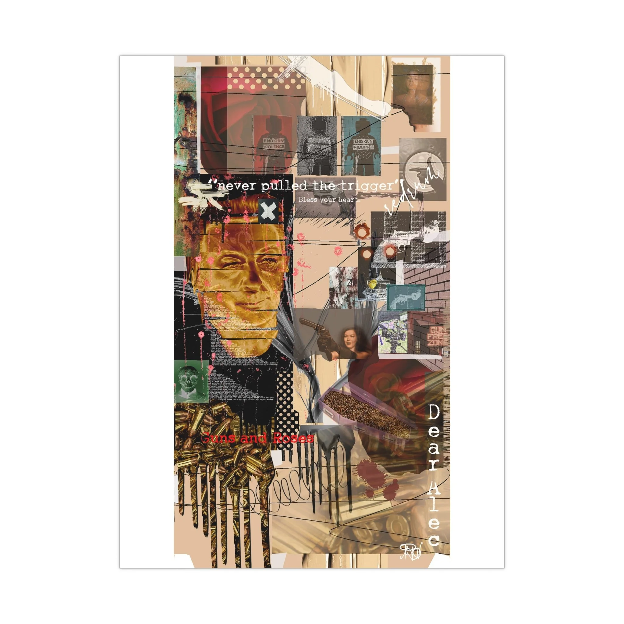 This contemporary collage artwork features a complex mixed-media composition combining photography, illustration, and textual elements on a neutral beige background. The piece incorporates layered imagery including portraits, architectural elements, ammunition shells, and abstract shapes arranged in an overlapping grid pattern. Prominent text overlays include phrases like "never pulled the trigger," "Bless your heart," and "Dear Ate," addressing themes of gun violence and social commentary. The color palette ranges from muted earth tones to vibrant reds and golds, with various translucent and opaque layers creating visual depth. The style blends contemporary digital art techniques with traditional collage methods, resulting in a visually dense and thought-provoking artistic statement.artwork by John Ridlon