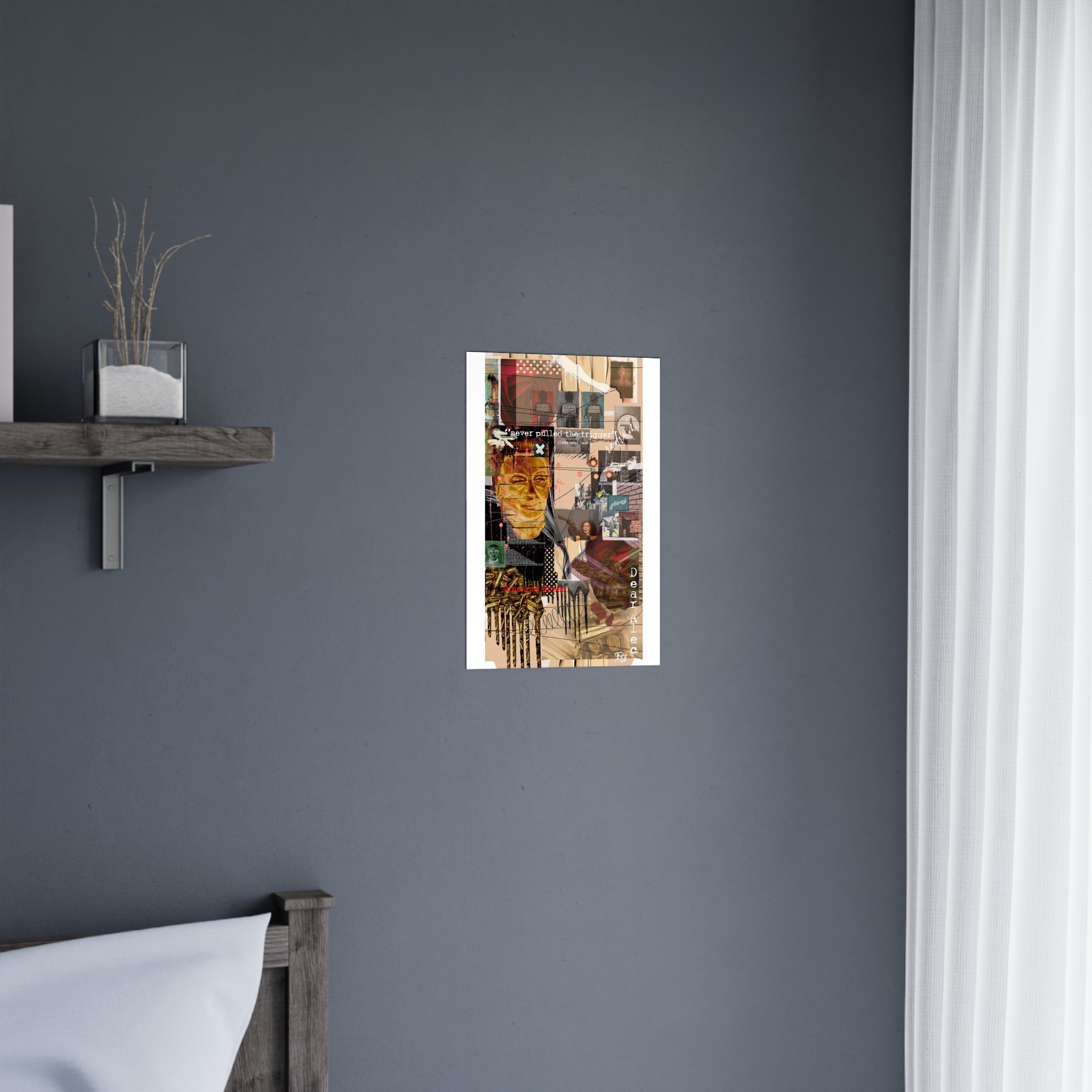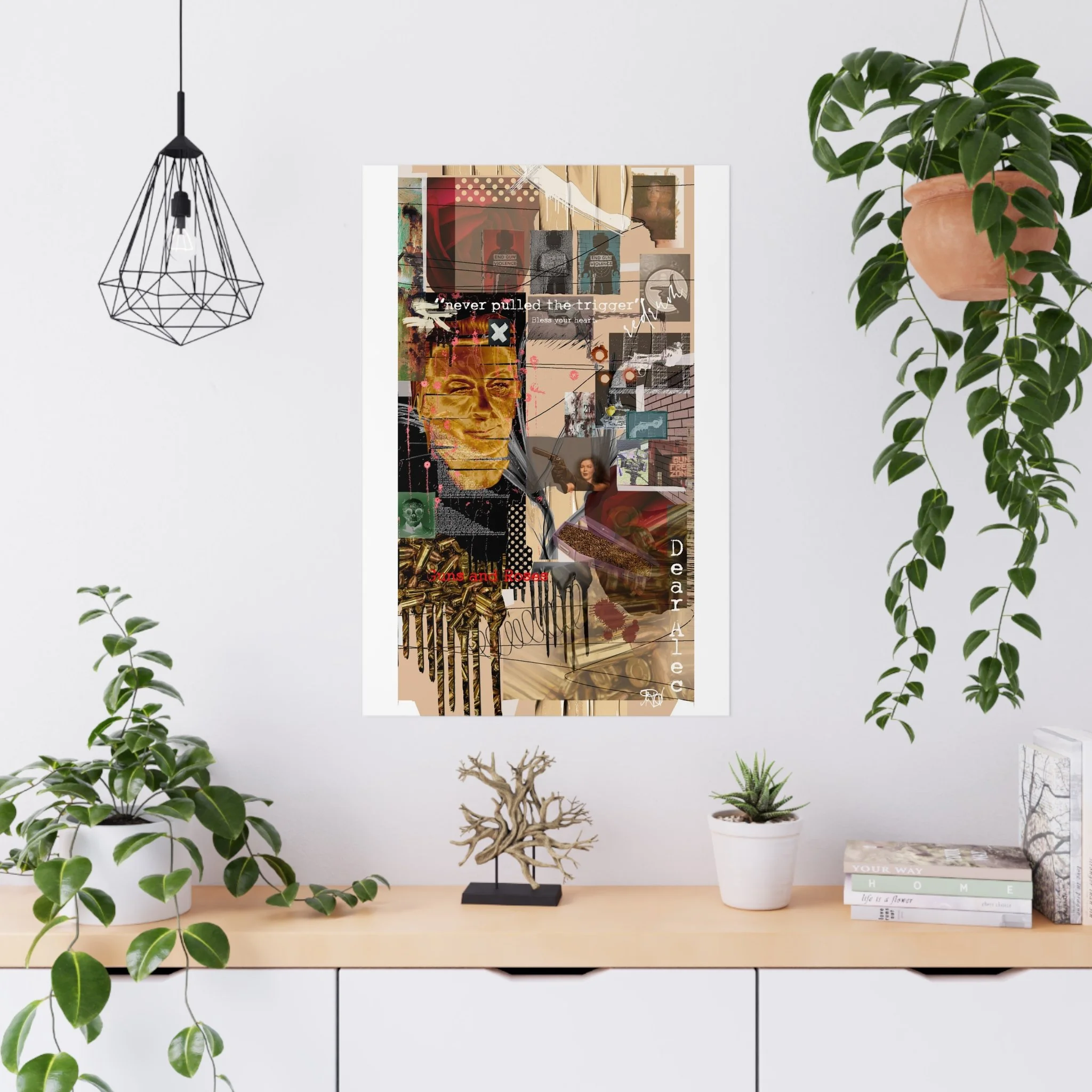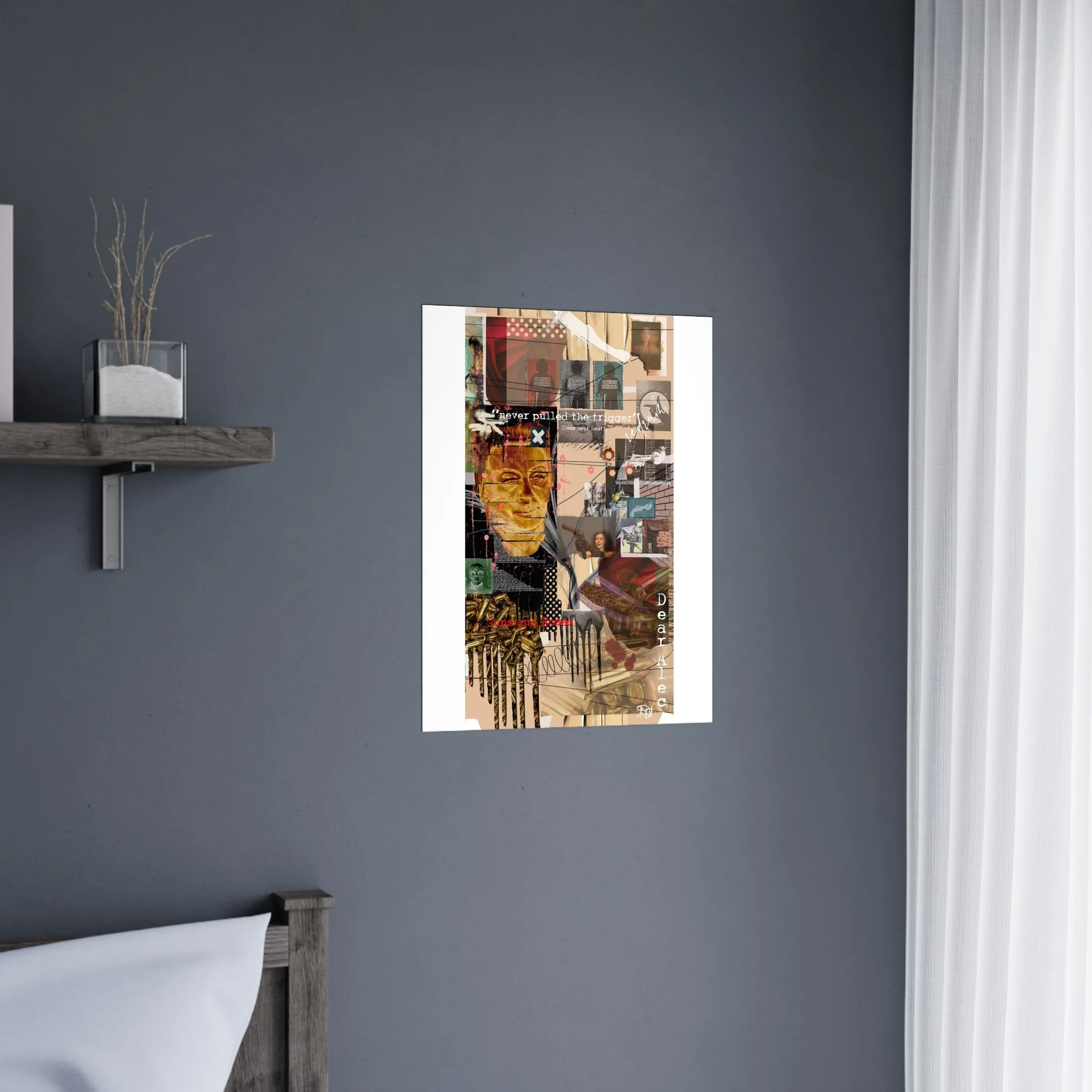 This contemporary collage artwork features a complex mixed-media composition combining photography, illustration, and textual elements on a neutral beige background. The piece incorporates layered imagery including portraits, architectural elements, ammunition shells, and abstract shapes arranged in an overlapping grid pattern. Prominent text overlays include phrases like "never pulled the trigger," "Bless your heart," and "Dear Ate," addressing themes of gun violence and social commentary. The color palette ranges from muted earth tones to vibrant reds and golds, with various translucent and opaque layers creating visual depth. The style blends contemporary digital art techniques with traditional collage methods, resulting in a visually dense and thought-provoking artistic statement.artwork by John Ridlon