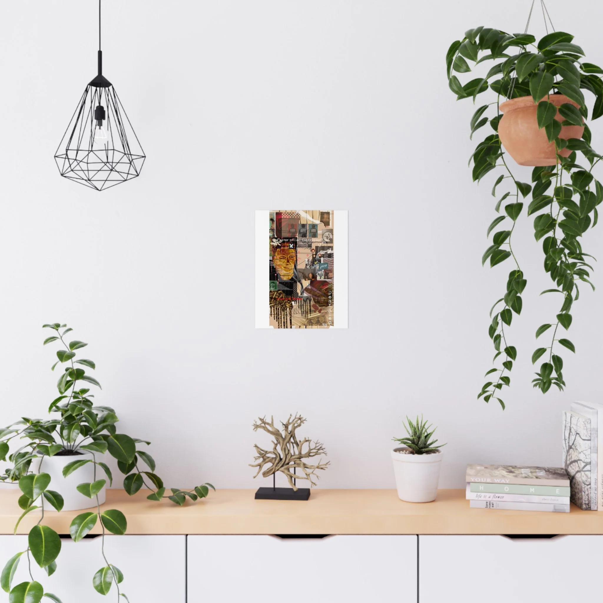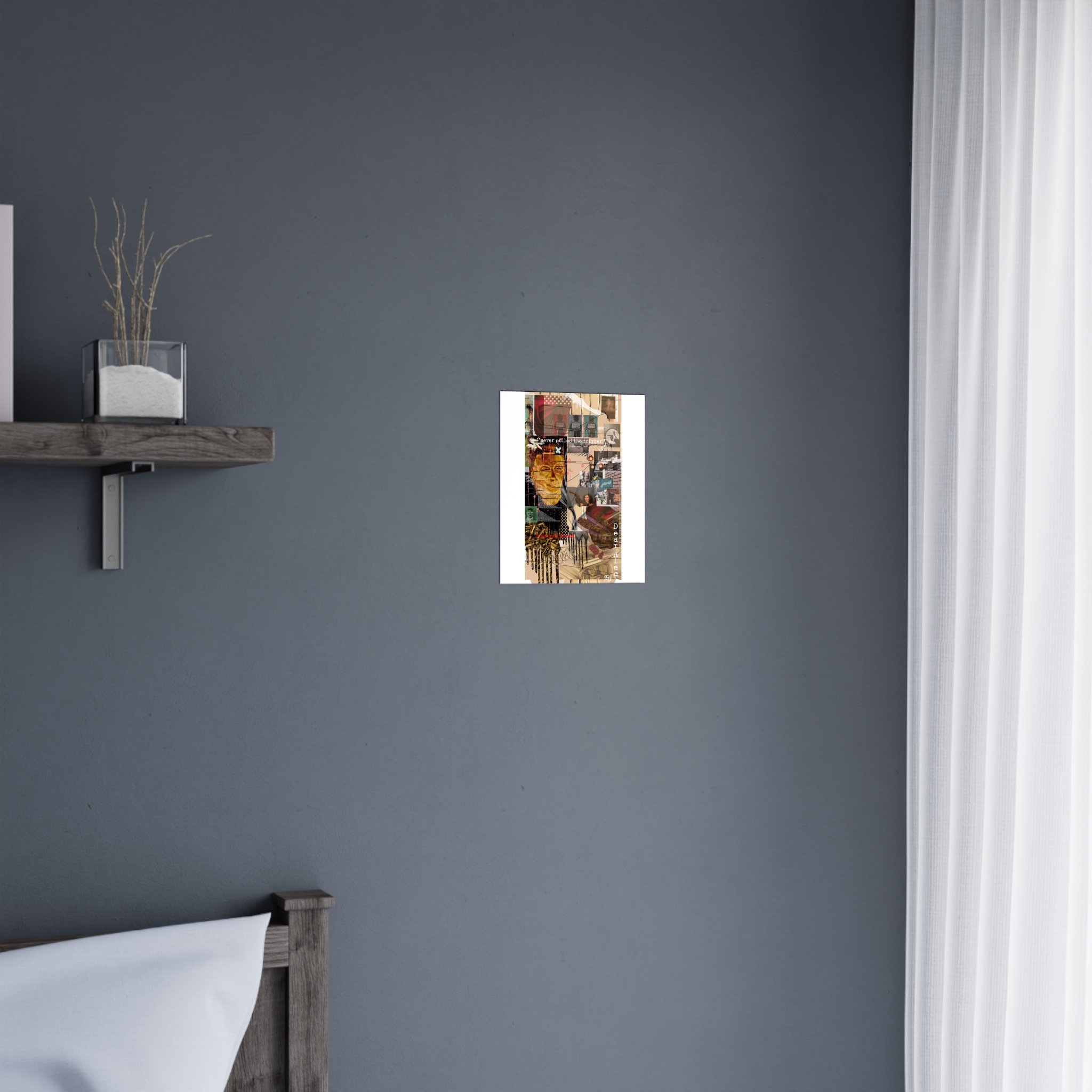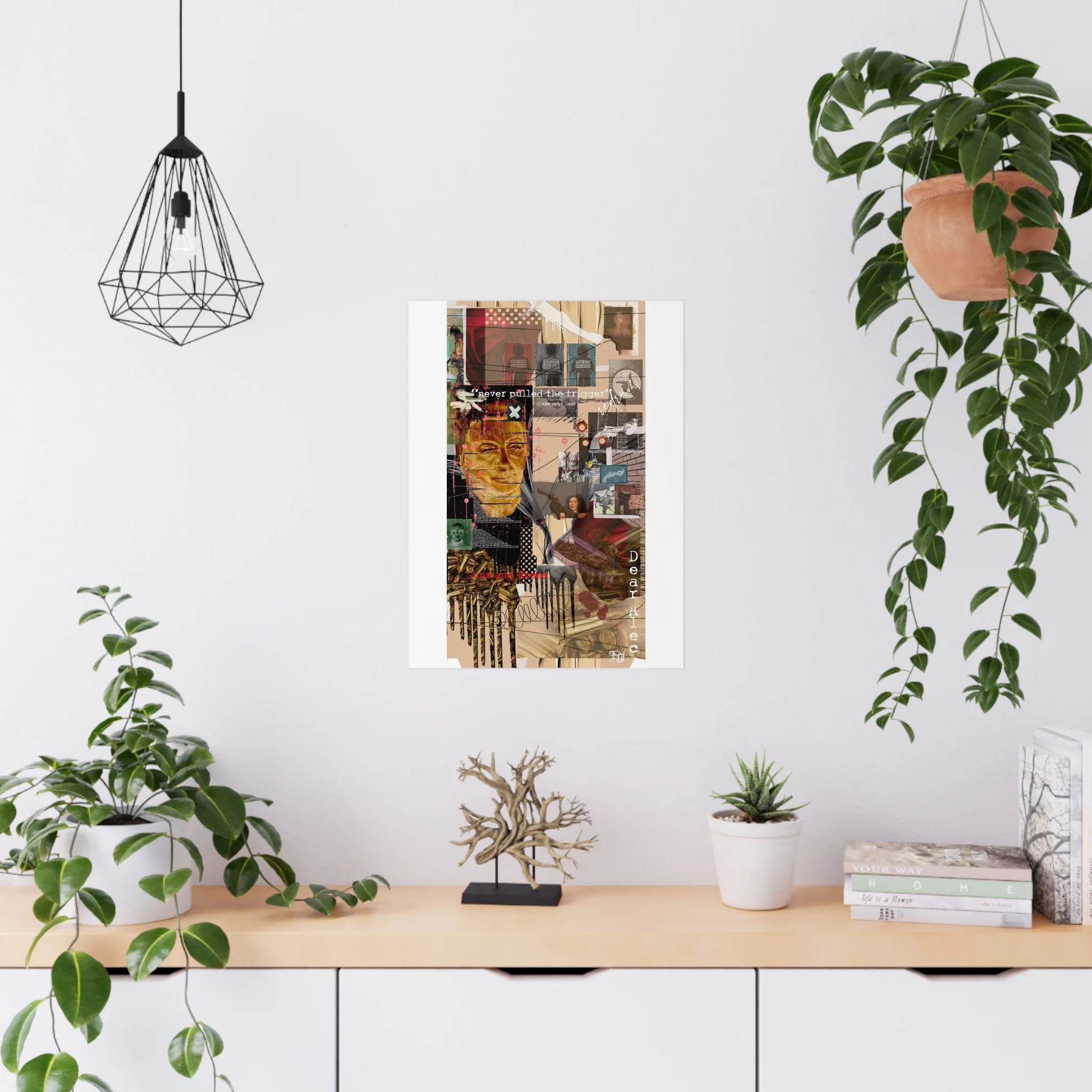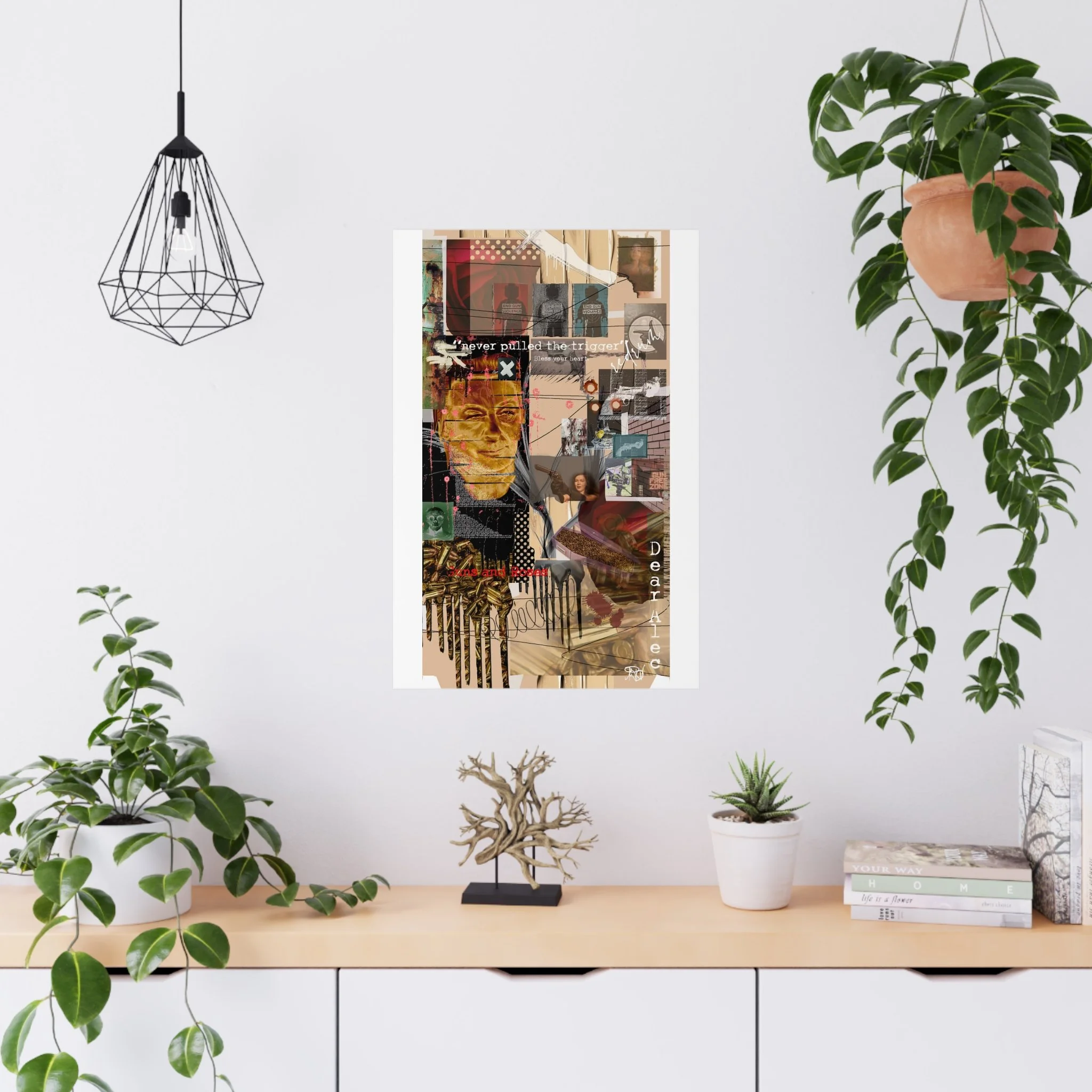 This contemporary collage artwork features a complex mixed-media composition combining photography, illustration, and textual elements on a neutral beige background. The piece incorporates layered imagery including portraits, architectural elements, ammunition shells, and abstract shapes arranged in an overlapping grid pattern. Prominent text overlays include phrases like "never pulled the trigger," "Bless your heart," and "Dear Ate," addressing themes of gun violence and social commentary. The color palette ranges from muted earth tones to vibrant reds and golds, with various translucent and opaque layers creating visual depth. The style blends contemporary digital art techniques with traditional collage methods, resulting in a visually dense and thought-provoking artistic statement.artwork by John Ridlon