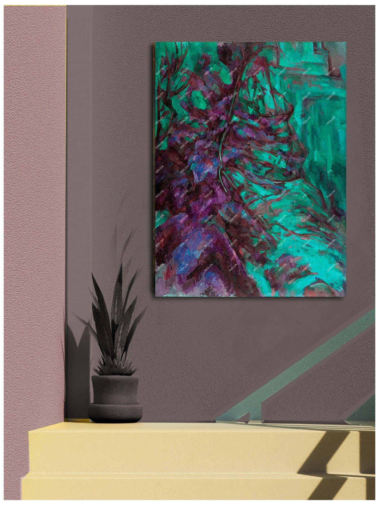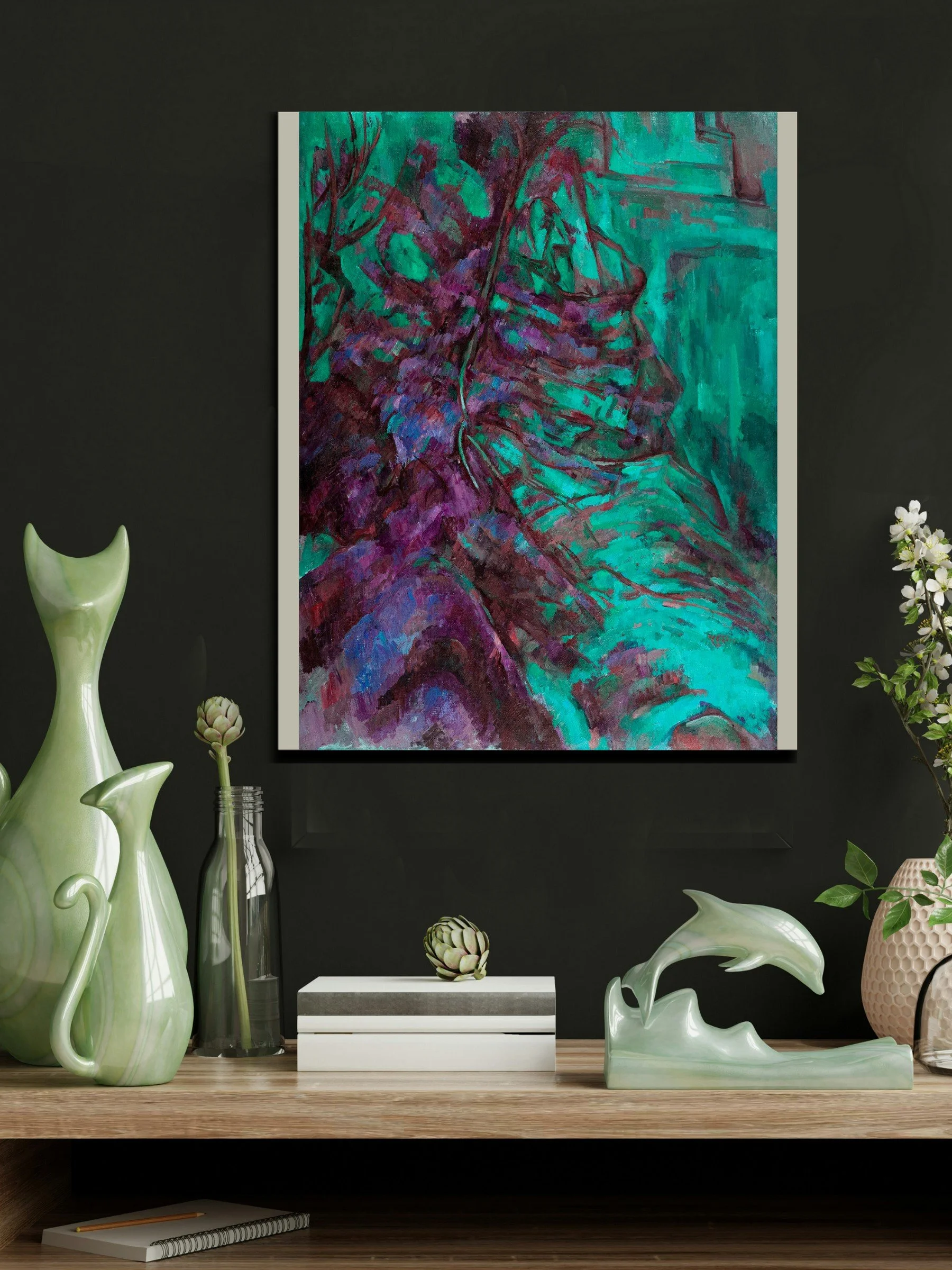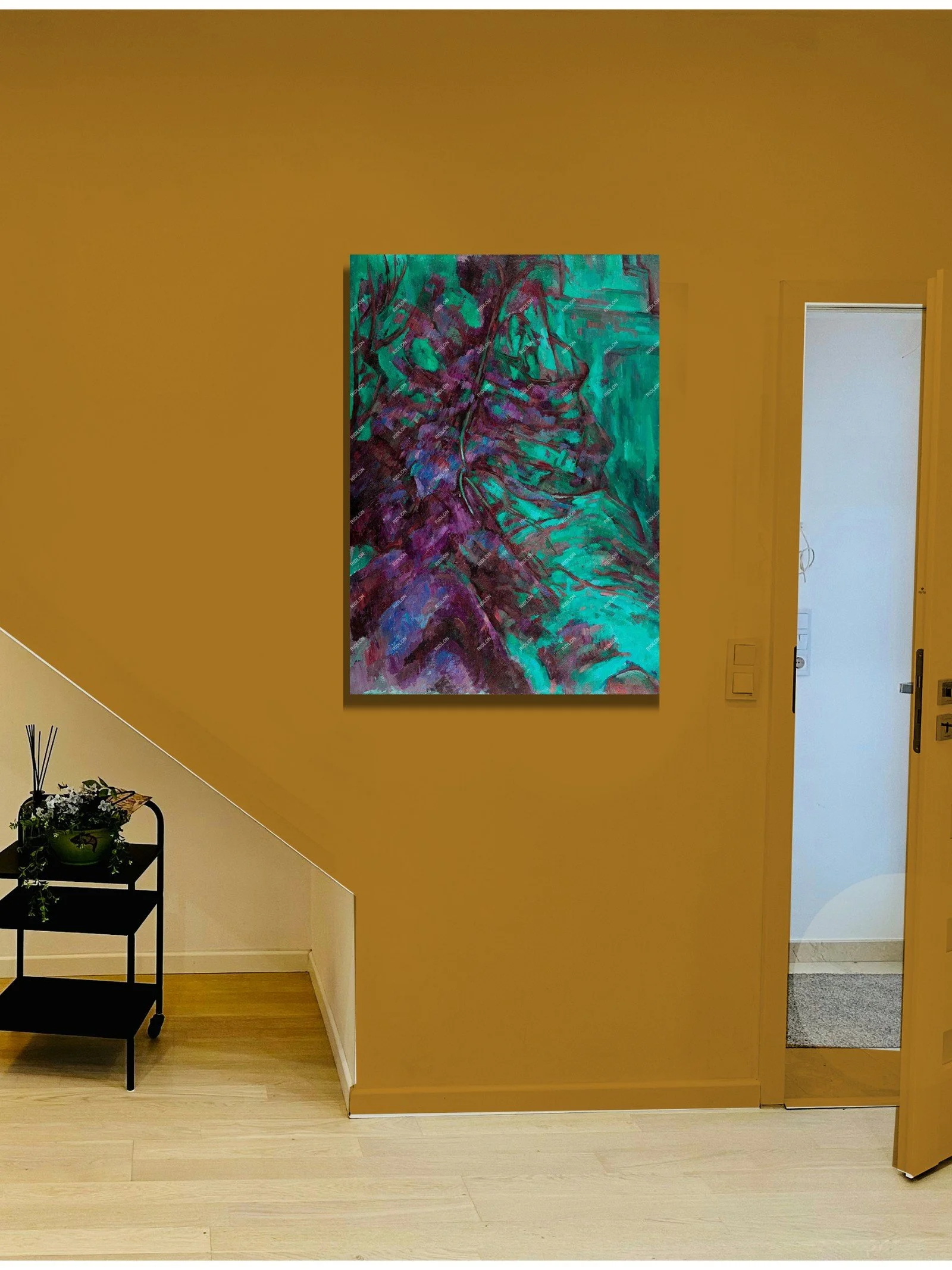 This abstract expressionist painting features a dynamic composition dominated by contrasting jewel tones of emerald green and deep burgundy, accented with touches of blue and purple throughout. The layered brushwork creates a textured, energetic surface with bold gestural marks that suggest movement and emotional intensity. Dark maroon and purple forms overlap against the vibrant turquoise background, creating a sense of depth and visual tension. The artist employs rapid, expressive brushstrokes and visible paint application techniques typical of contemporary abstract art, with areas of blending alongside deliberate gestural marks. The overall effect is a moody, contemplative piece that emphasizes color relationships and spontaneous artistic expression rather than representational imagery.