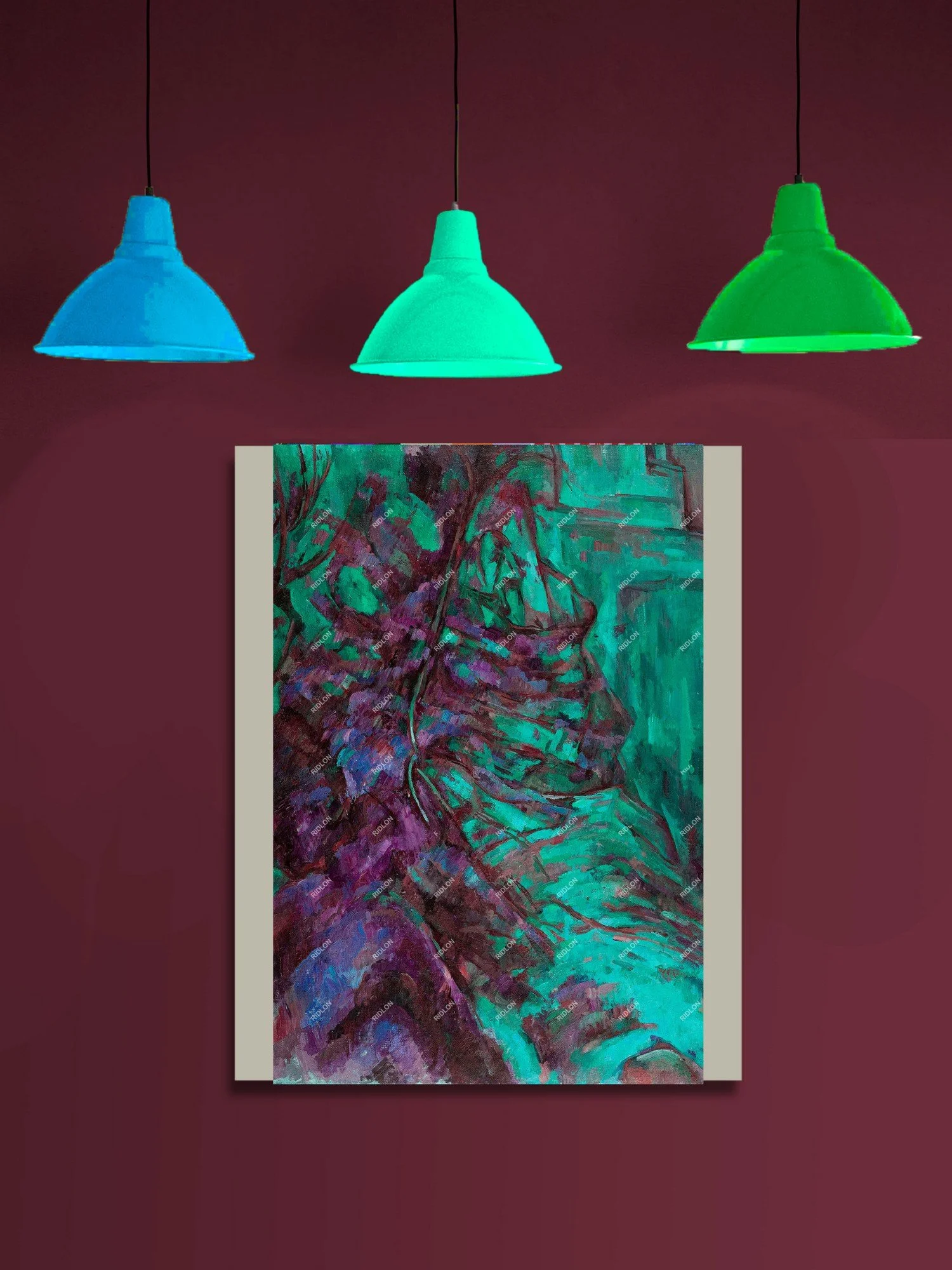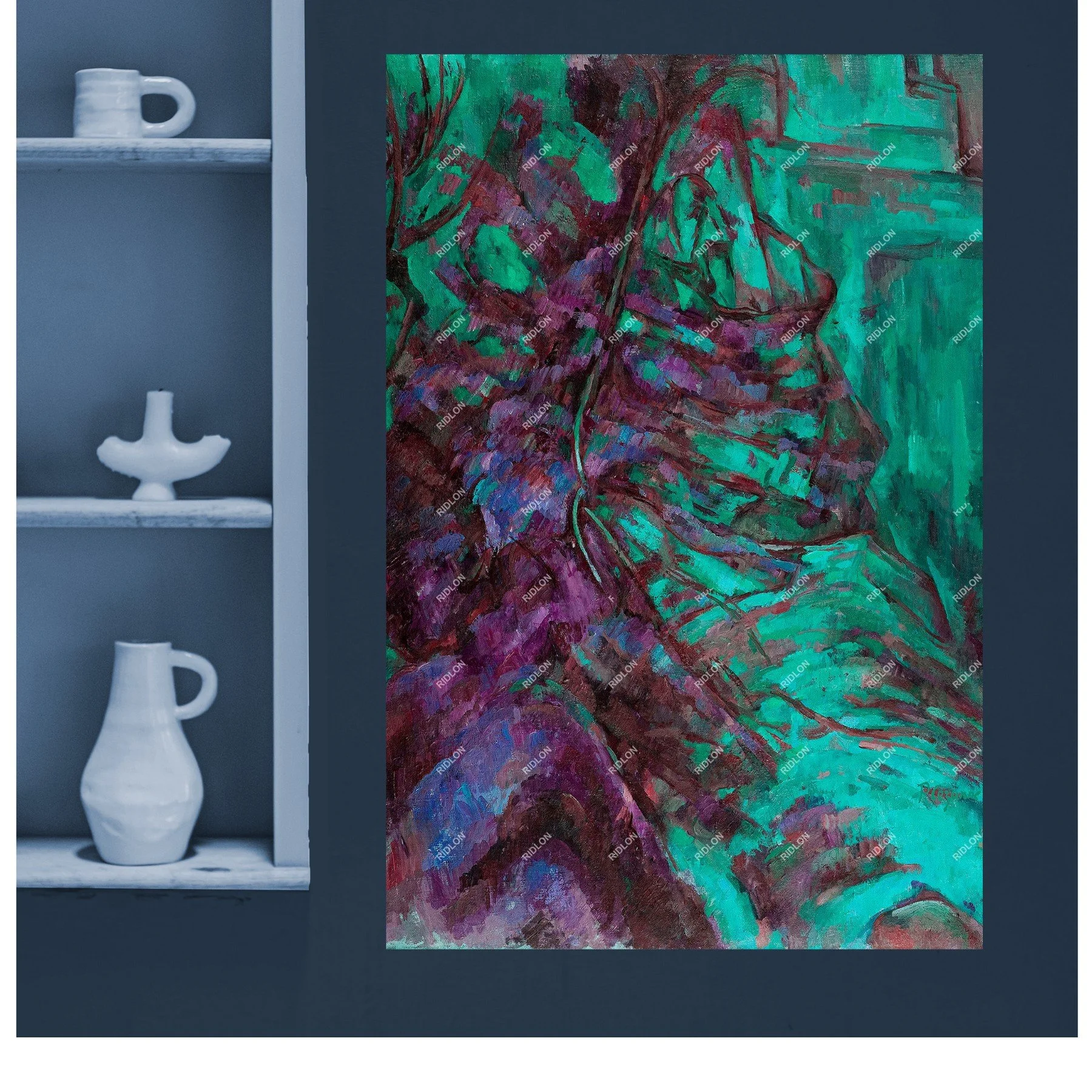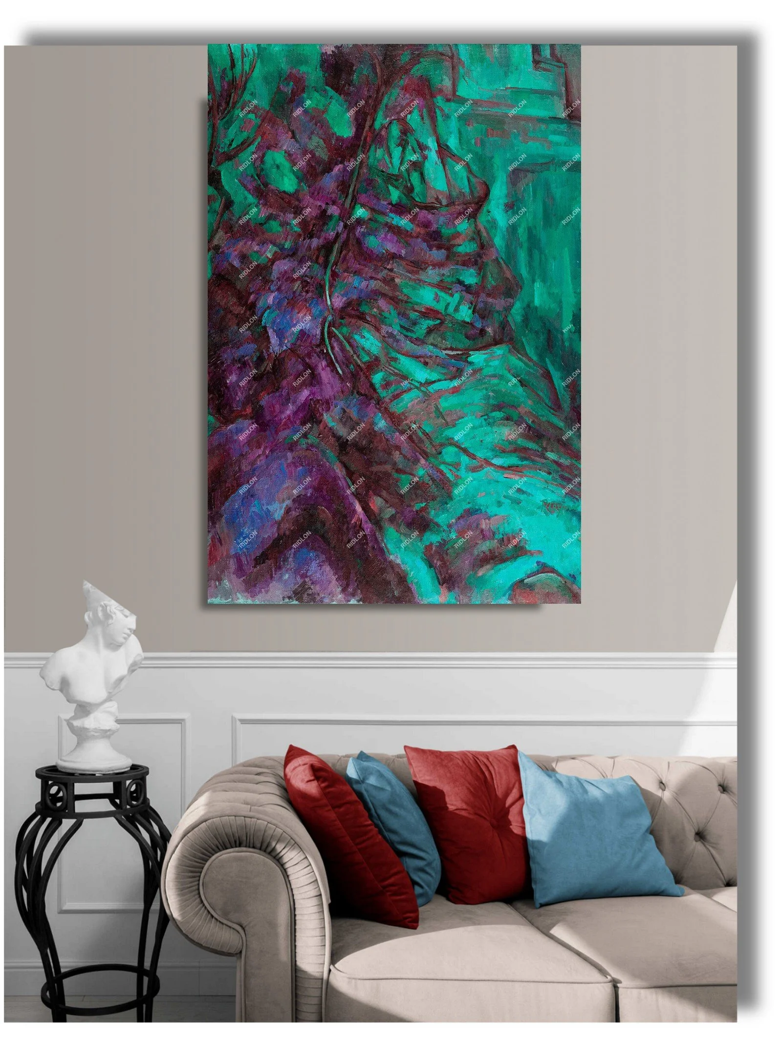 This abstract expressionist painting features a dynamic composition dominated by contrasting jewel tones of emerald green and deep burgundy, accented with touches of blue and purple throughout. The layered brushwork creates a textured, energetic surface with bold gestural marks that suggest movement and emotional intensity. Dark maroon and purple forms overlap against the vibrant turquoise background, creating a sense of depth and visual tension. The artist employs rapid, expressive brushstrokes and visible paint application techniques typical of contemporary abstract art, with areas of blending alongside deliberate gestural marks. The overall effect is a moody, contemplative piece that emphasizes color relationships and spontaneous artistic expression rather than representational imagery.
