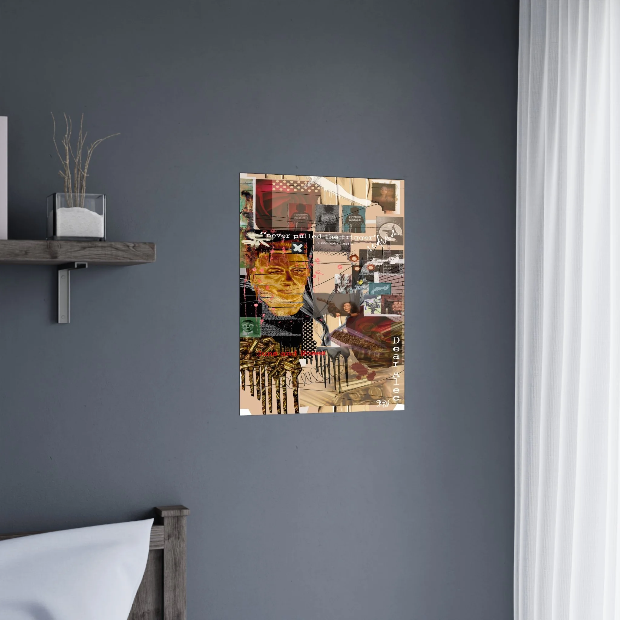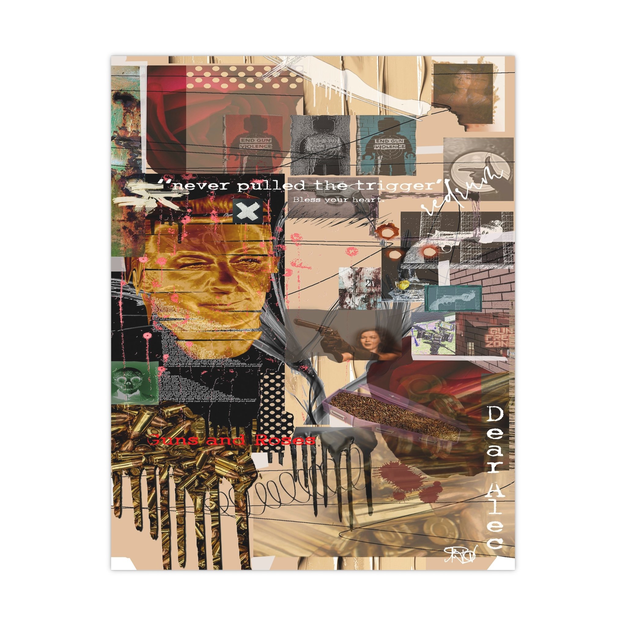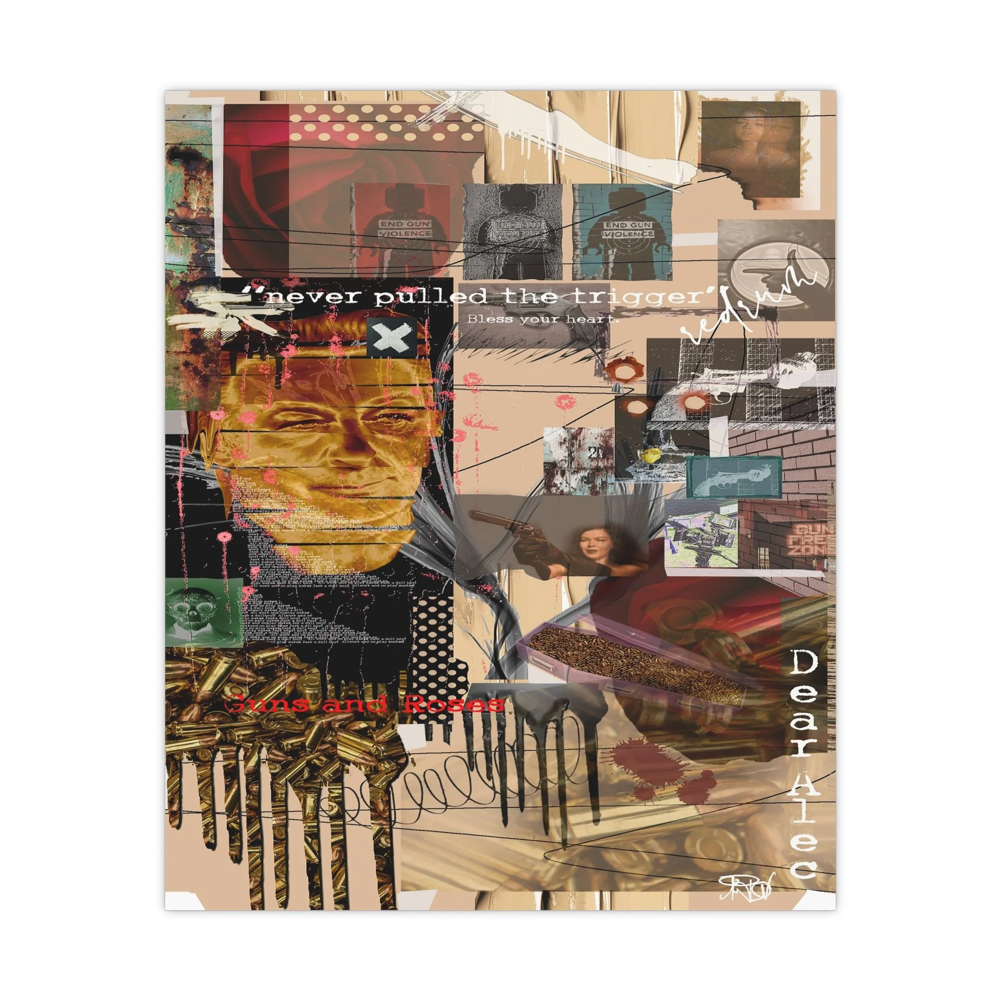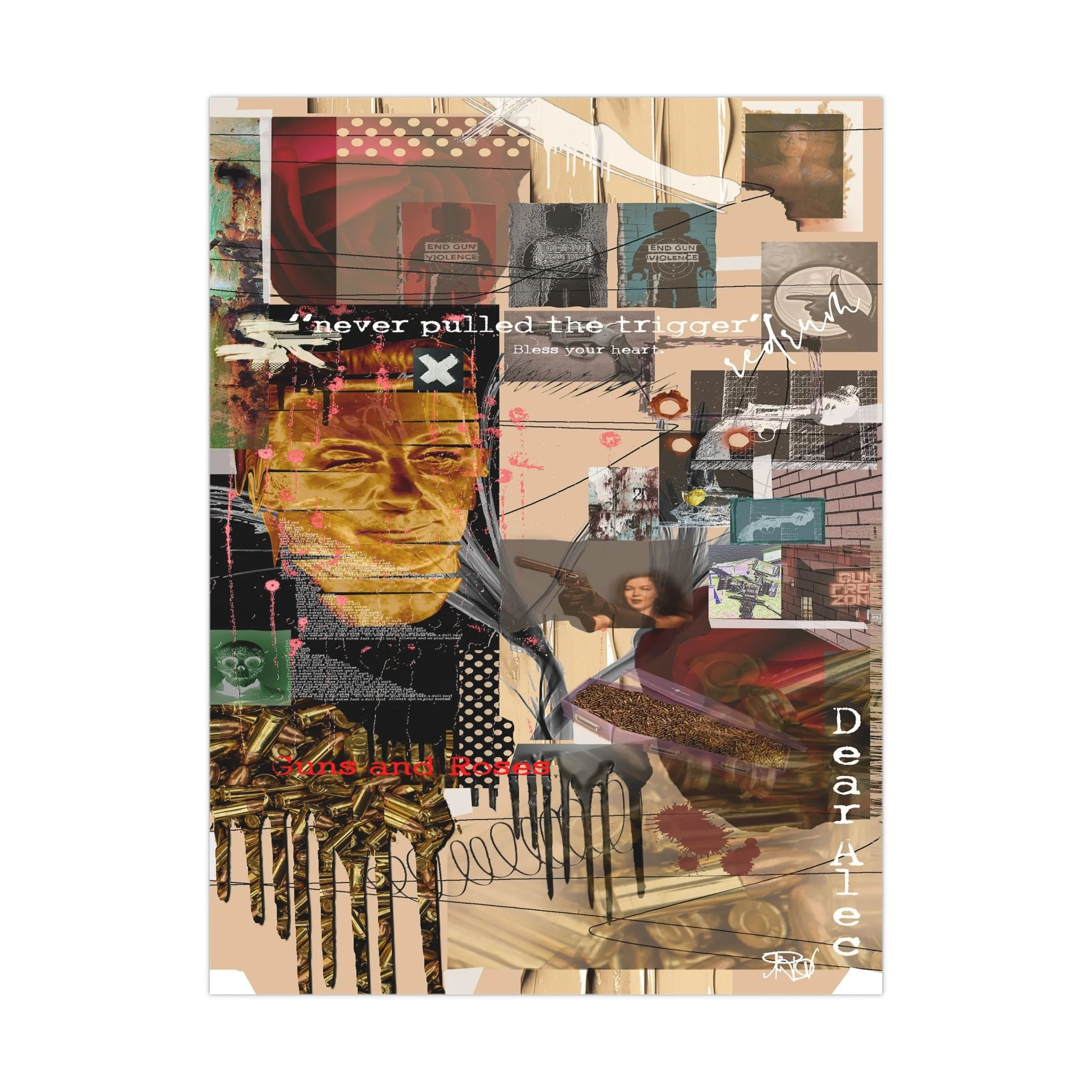 This contemporary digital collage artwork features a complex layering of mixed media elements including photographs, typography, and abstract graphics arranged on a neutral beige background. The composition incorporates prominent text phrases such as "never pulled the trigger," "Bless your heart," and "Dear Ate," alongside various imagery including portraits, ammunition, architectural elements, and decorative patterns. The style blends glitch art aesthetics with street art sensibilities, utilizing overlapping transparent layers, hand-drawn marks, and distorted photographic elements to create visual depth and movement. Color accents of red, gold, teal, and pink punctuate the predominantly warm-toned composition, while repeated motifs like polka dots and X marks add visual rhythm throughout. The overall effect is a densely layered, thought-provoking piece that addresses themes of violence and emotion through its juxtaposition of contrasting visual elements and symbolic imagery.artwork by John Ridlon
