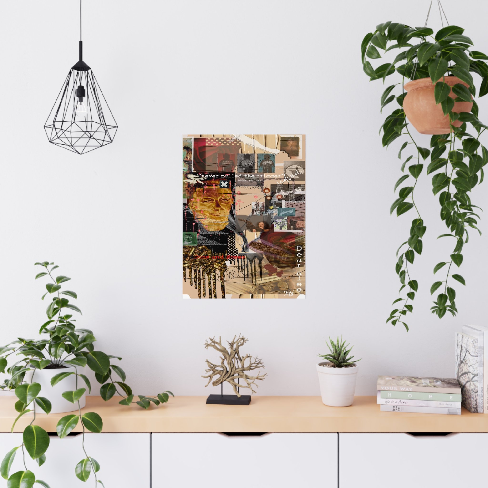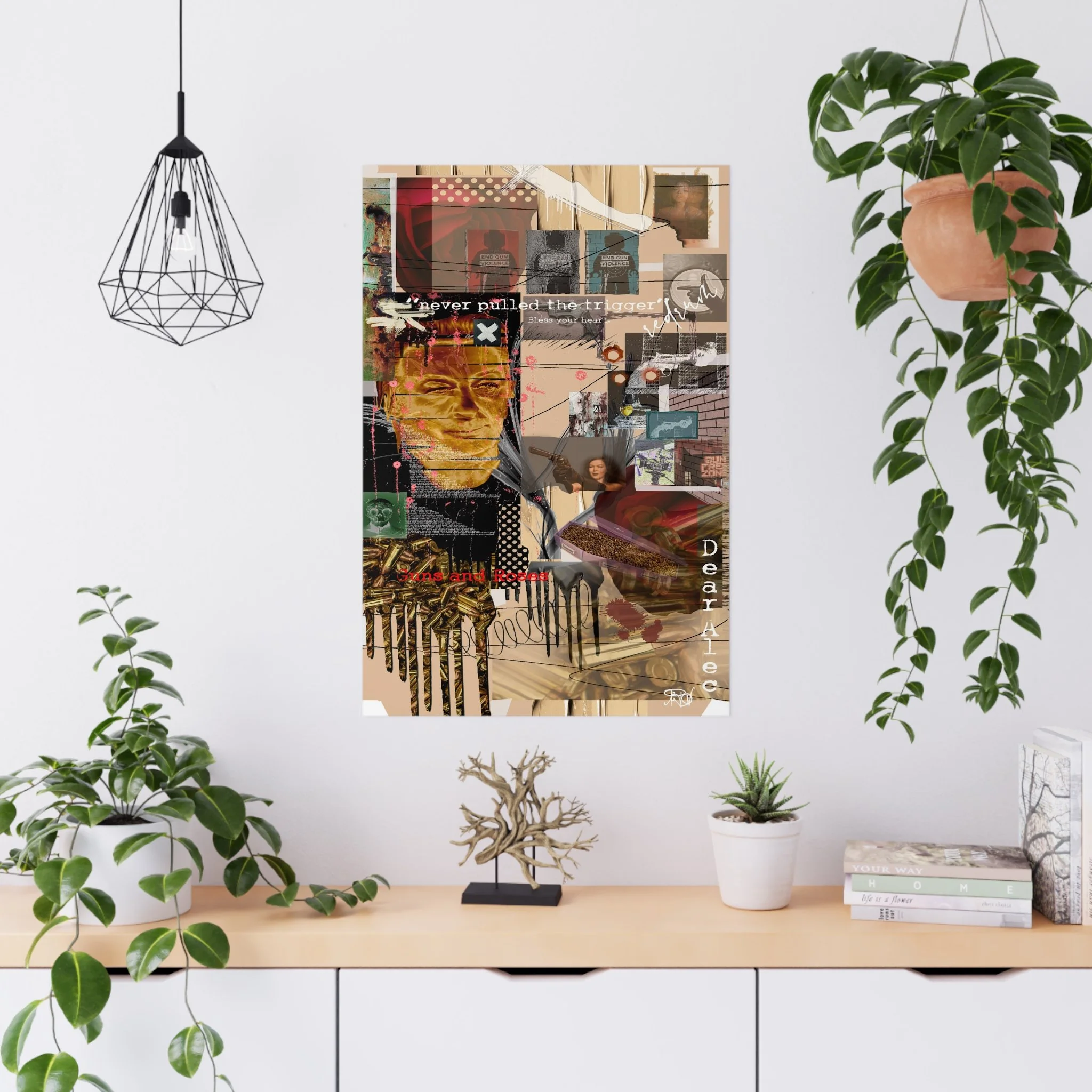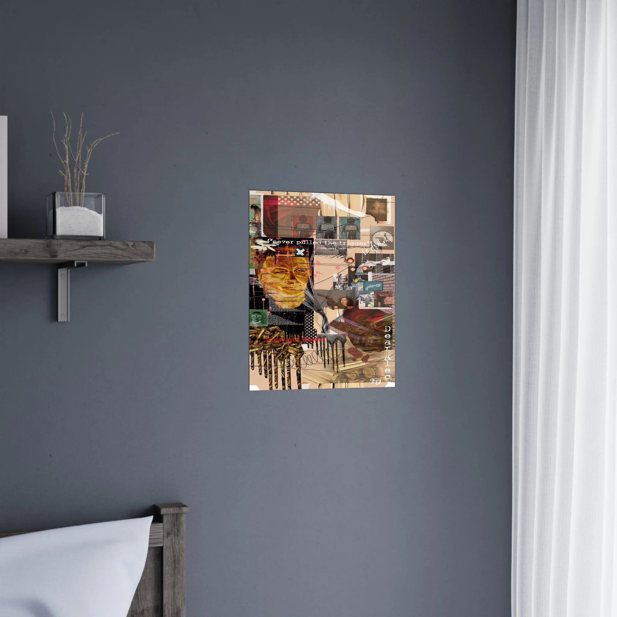 This contemporary digital collage artwork features a complex layering of mixed media elements including photographs, typography, and abstract graphics arranged on a neutral beige background. The composition incorporates prominent text phrases such as "never pulled the trigger," "Bless your heart," and "Dear Ate," alongside various imagery including portraits, ammunition, architectural elements, and decorative patterns. The style blends glitch art aesthetics with street art sensibilities, utilizing overlapping transparent layers, hand-drawn marks, and distorted photographic elements to create visual depth and movement. Color accents of red, gold, teal, and pink punctuate the predominantly warm-toned composition, while repeated motifs like polka dots and X marks add visual rhythm throughout. The overall effect is a densely layered, thought-provoking piece that addresses themes of violence and emotion through its juxtaposition of contrasting visual elements and symbolic imagery.artwork by John Ridlon