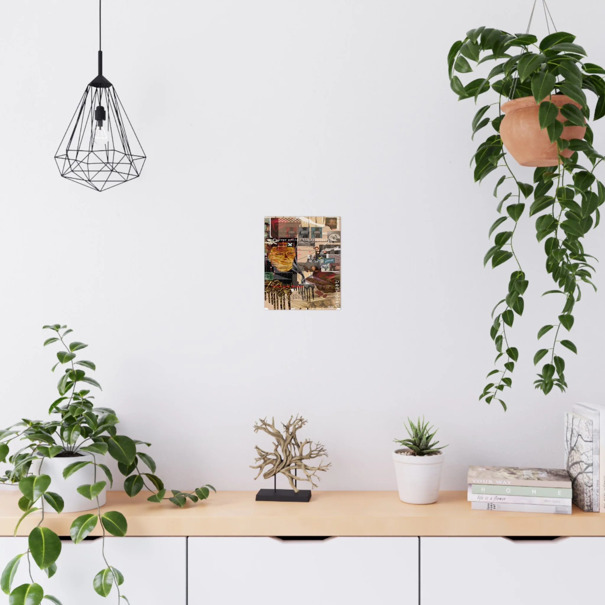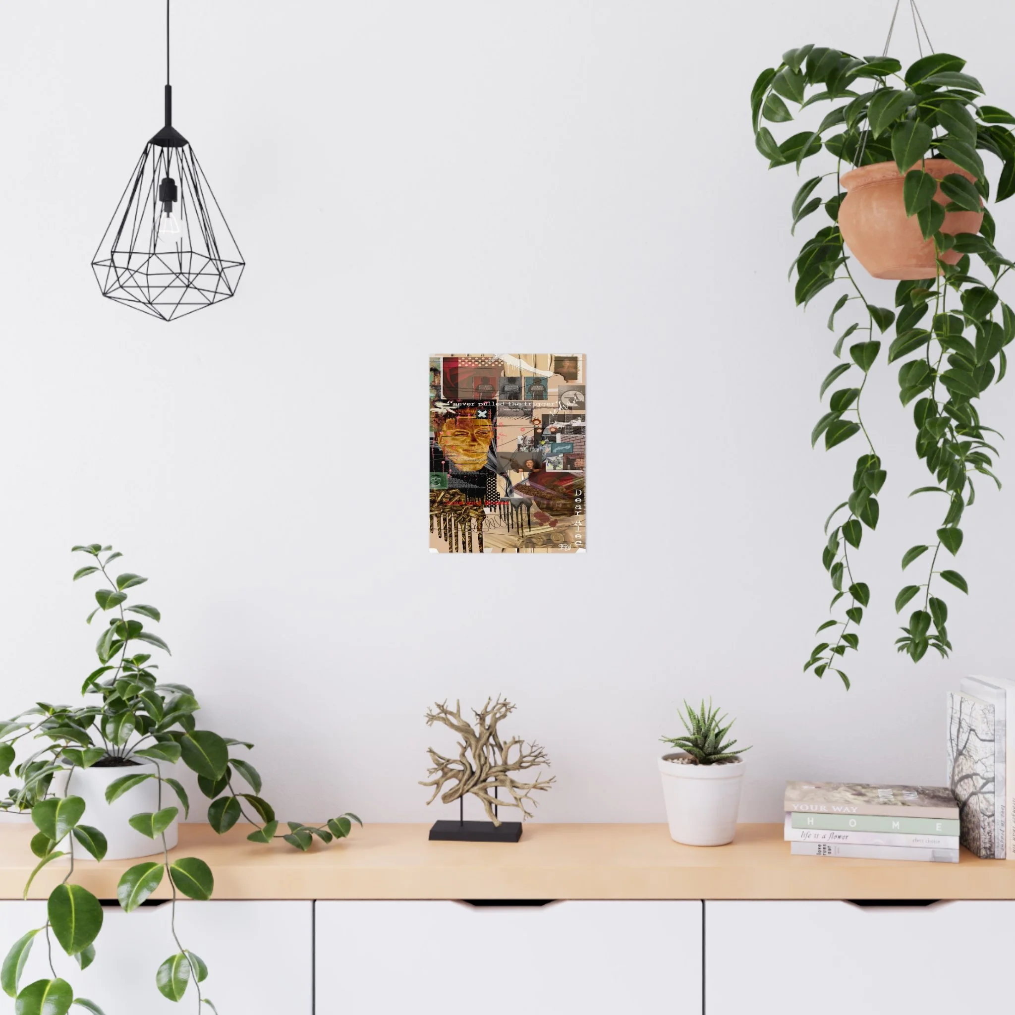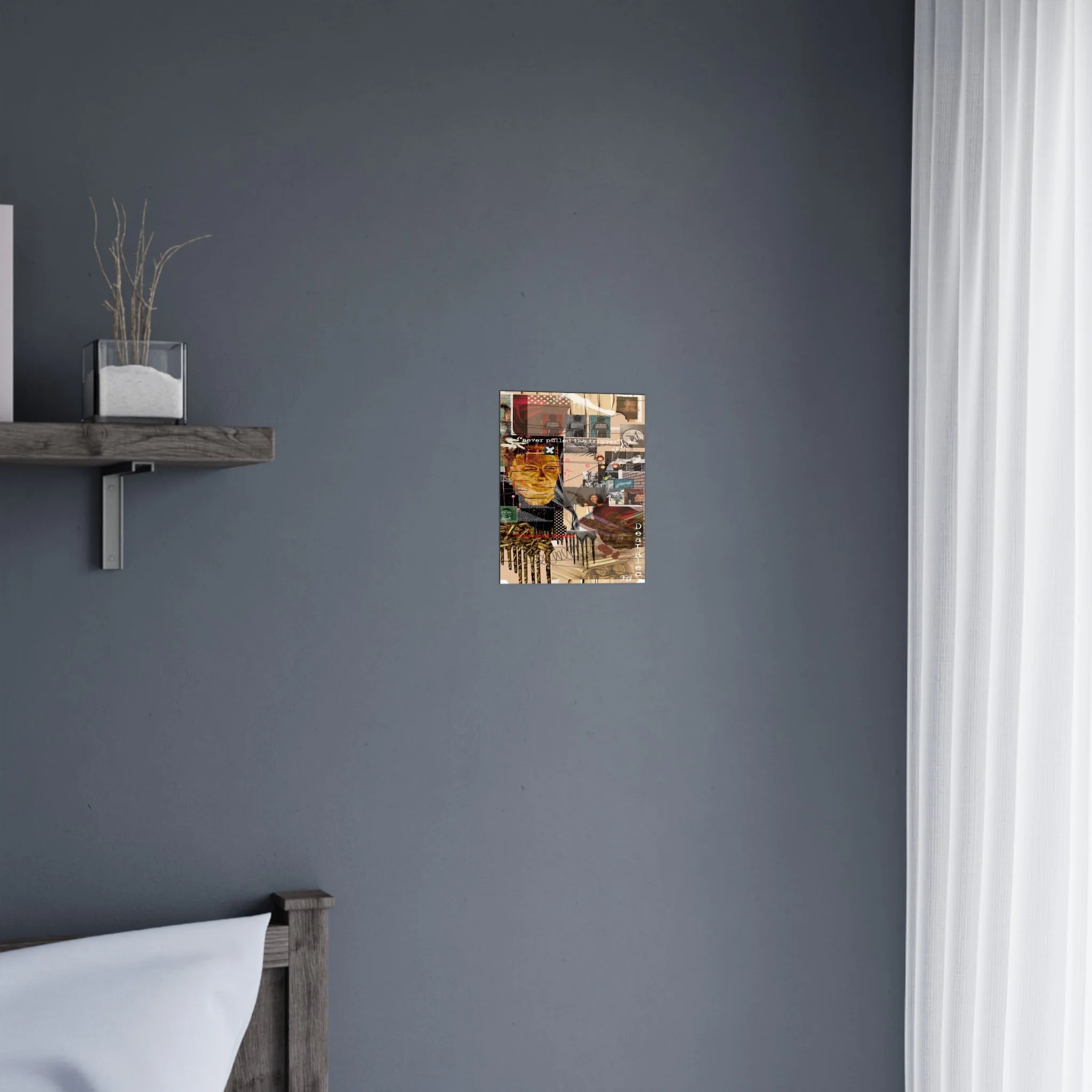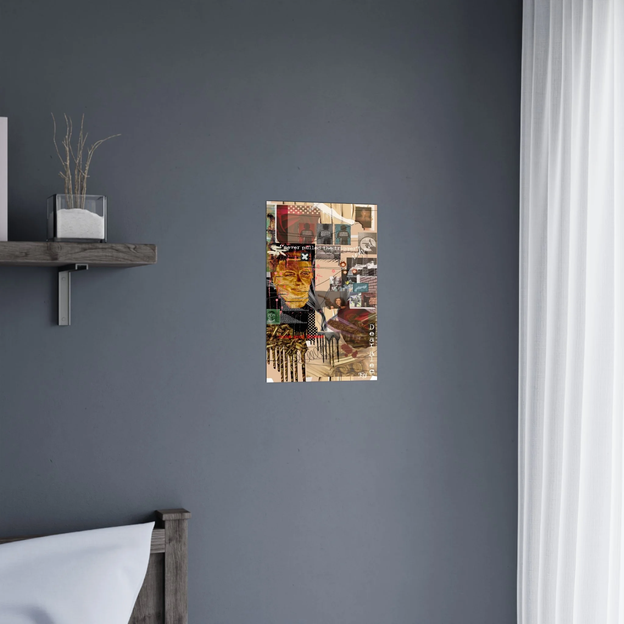 This contemporary digital collage artwork features a complex layering of mixed media elements including photographs, typography, and abstract graphics arranged on a neutral beige background. The composition incorporates prominent text phrases such as "never pulled the trigger," "Bless your heart," and "Dear Ate," alongside various imagery including portraits, ammunition, architectural elements, and decorative patterns. The style blends glitch art aesthetics with street art sensibilities, utilizing overlapping transparent layers, hand-drawn marks, and distorted photographic elements to create visual depth and movement. Color accents of red, gold, teal, and pink punctuate the predominantly warm-toned composition, while repeated motifs like polka dots and X marks add visual rhythm throughout. The overall effect is a densely layered, thought-provoking piece that addresses themes of violence and emotion through its juxtaposition of contrasting visual elements and symbolic imagery.artwork by John Ridlon
