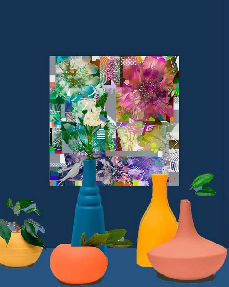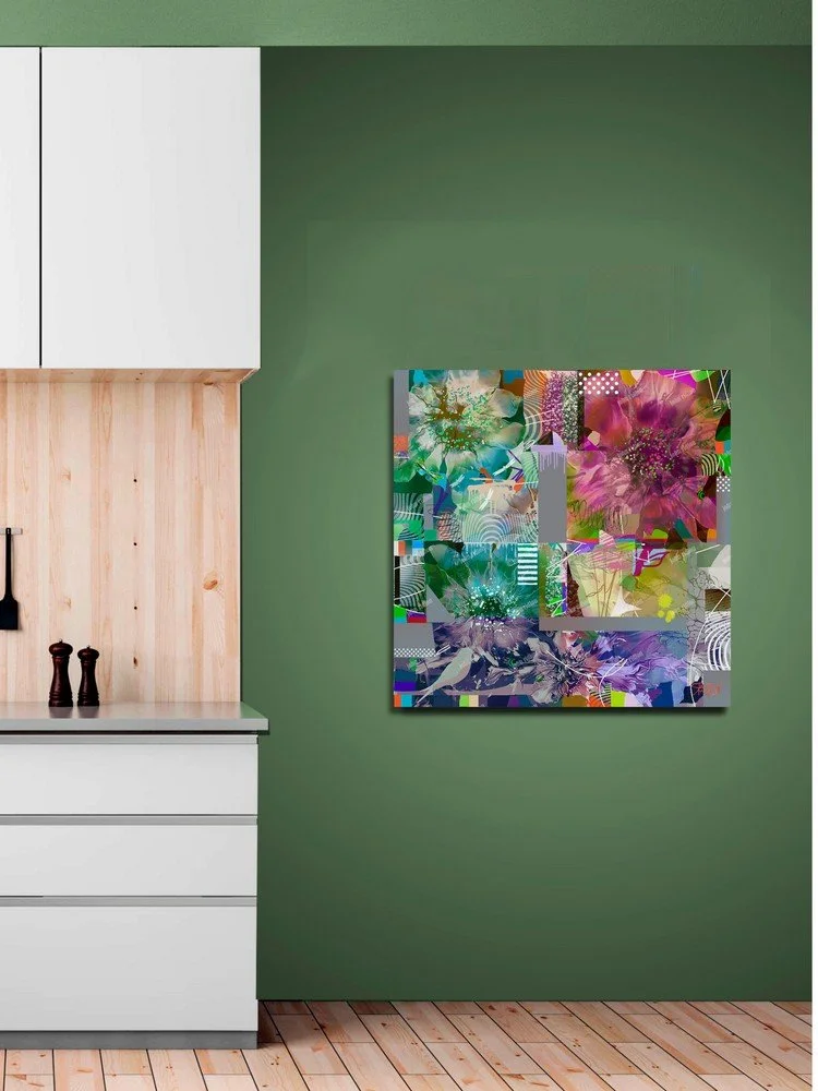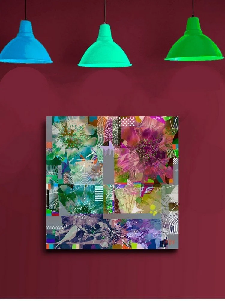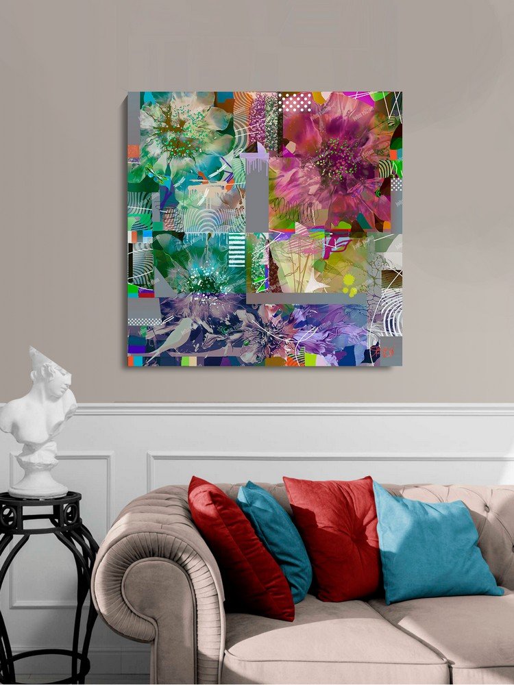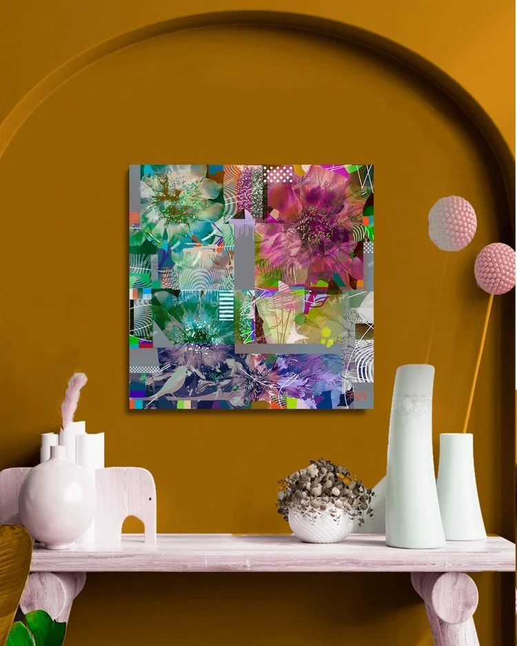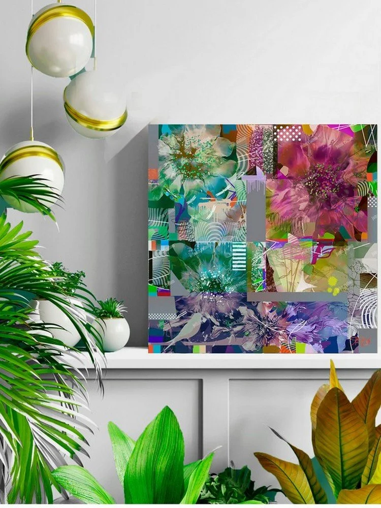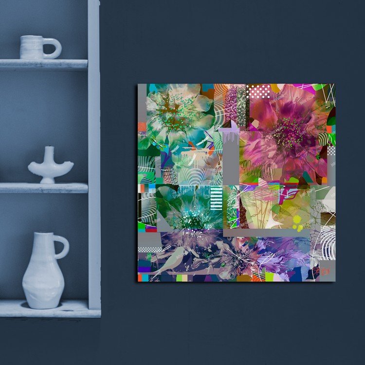 Bright, painterly florals burst across this poster in a modern patchwork of color. Petals dissolve into painterly textures—hot pinks, deep purples, teal blues and touches of silver—so the image reads like a gallery study rather than a simple print. Hung low over a couch or in a compact hallway, it brings energy without shouting. Choose satin for a gentle sheen that deepens color, or archival matte for museum-like texture and long-lasting fidelity. Printed and assembled in the USA on heavyweight stock, this piece holds up in lived-in spaces where art meets everyday life.