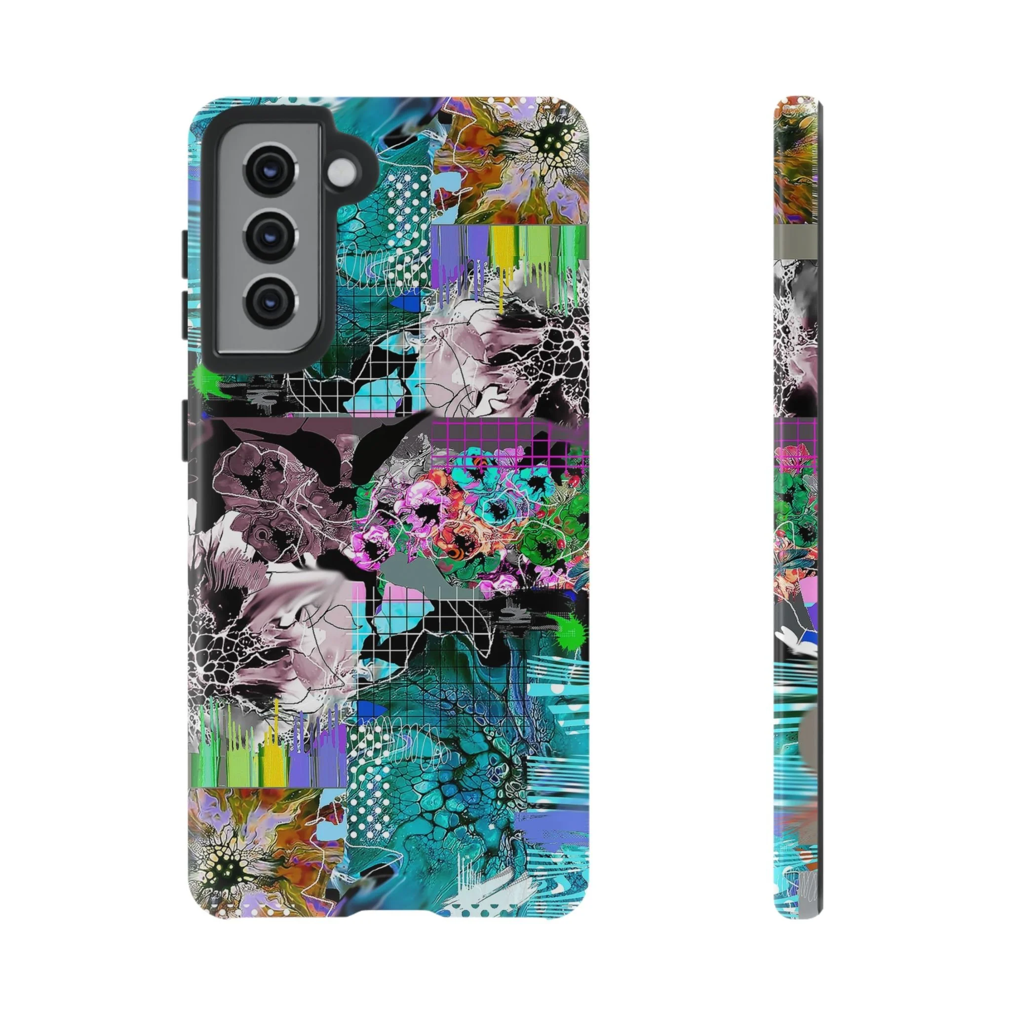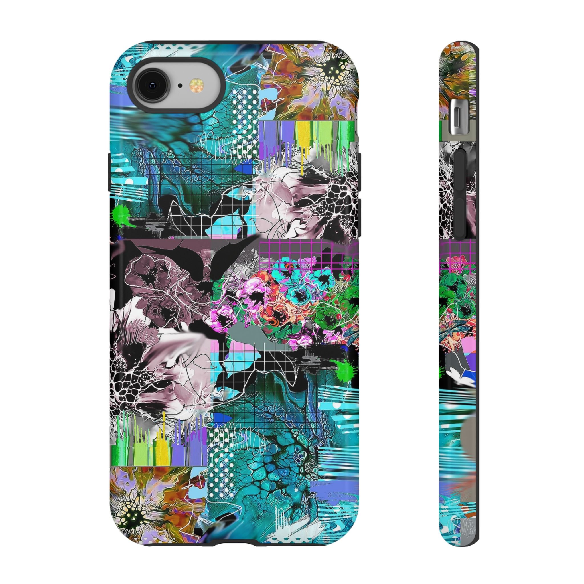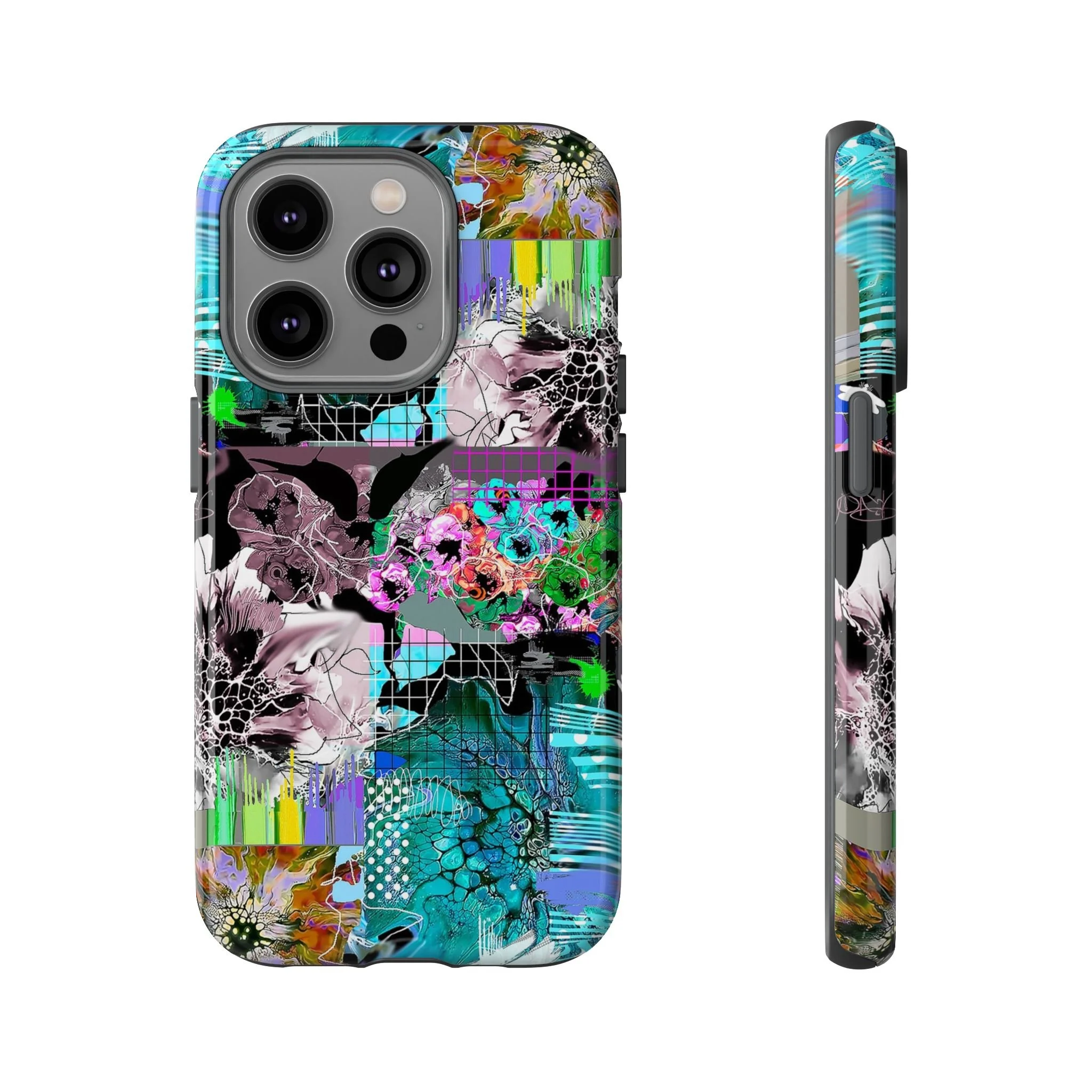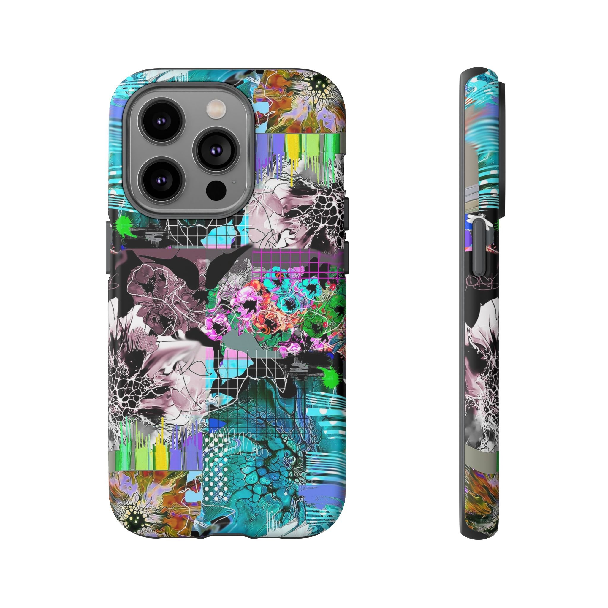 This vibrant digital artwork is a complex, layered composition featuring abstract floral and organic forms in a kaleidoscopic array of colors. Predominant teal, turquoise, and purple hues blend with bursts of green, pink, and yellow, creating a dynamic and visually explosive image. The artwork incorporates various textures, including honeycomb-like patterns, grid overlays, and fluid, organic shapes that seem to morph and flow across the canvas. Flower-like structures are distorted and reimagined through a digital lens, with some elements appearing crystalline or fractured, while others maintain a more painterly, soft-edged quality. The overall effect is a mesmerizing, almost psychedelic visual experience that blends digital art techniques with organic, natural inspiration.artwork bu John Ridlon