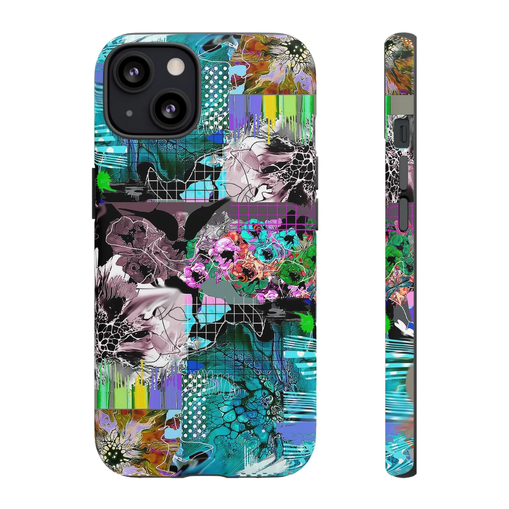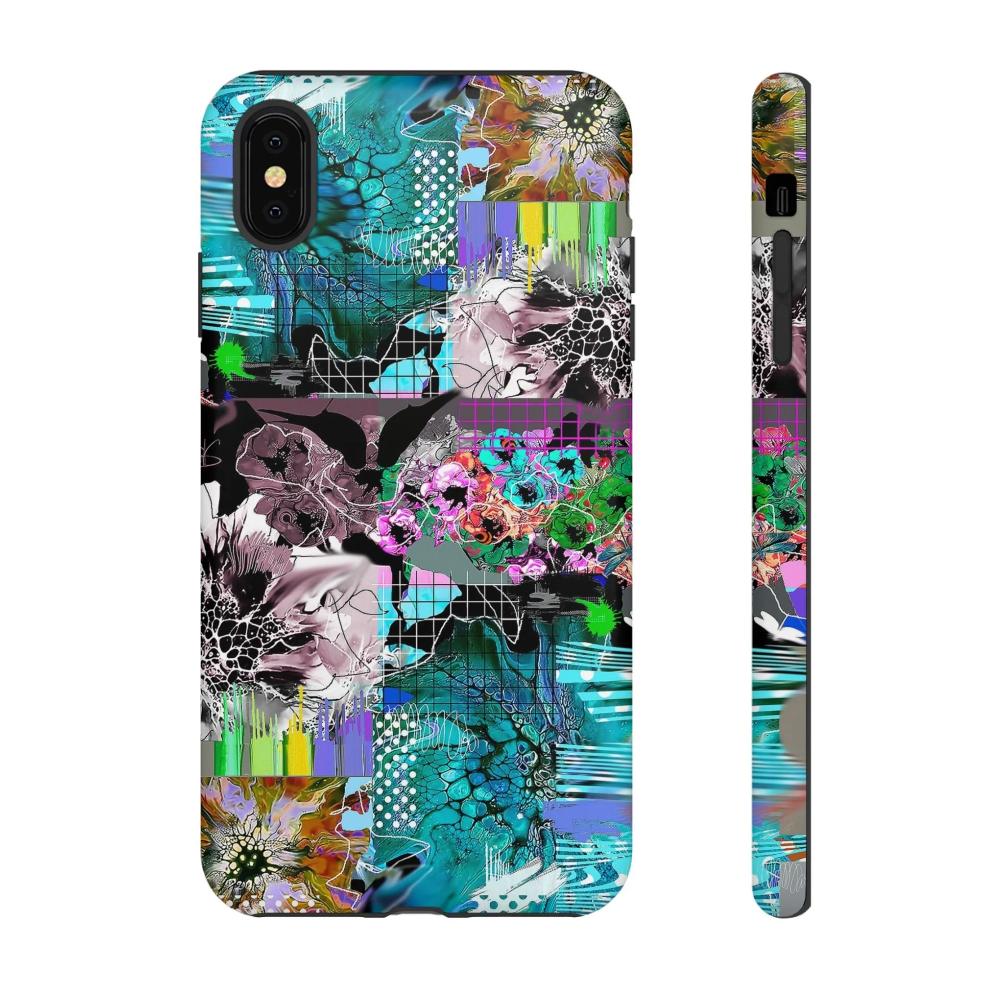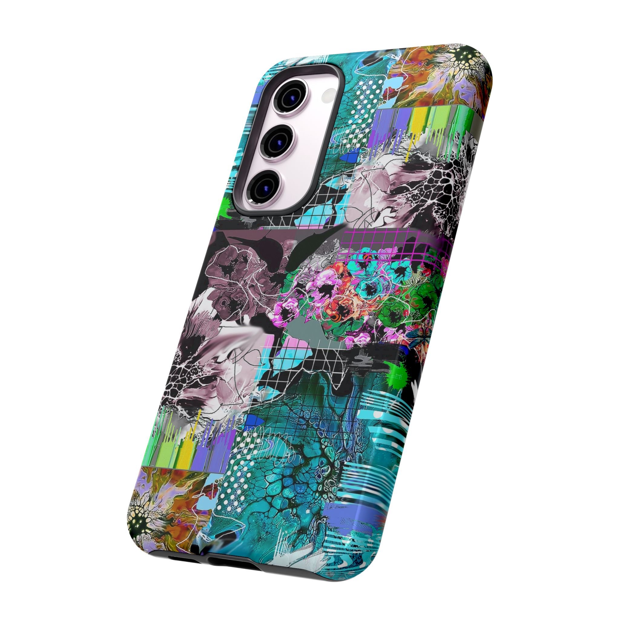 This vibrant digital artwork is a complex, layered composition featuring abstract floral and organic forms in a kaleidoscopic array of colors. Predominant teal, turquoise, and purple hues blend with bursts of green, pink, and yellow, creating a dynamic and visually explosive image. The artwork incorporates various textures, including honeycomb-like patterns, grid overlays, and fluid, organic shapes that seem to morph and flow across the canvas. Flower-like structures are distorted and reimagined through a digital lens, with some elements appearing crystalline or fractured, while others maintain a more painterly, soft-edged quality. The overall effect is a mesmerizing, almost psychedelic visual experience that blends digital art techniques with organic, natural inspiration.artwork bu John Ridlon