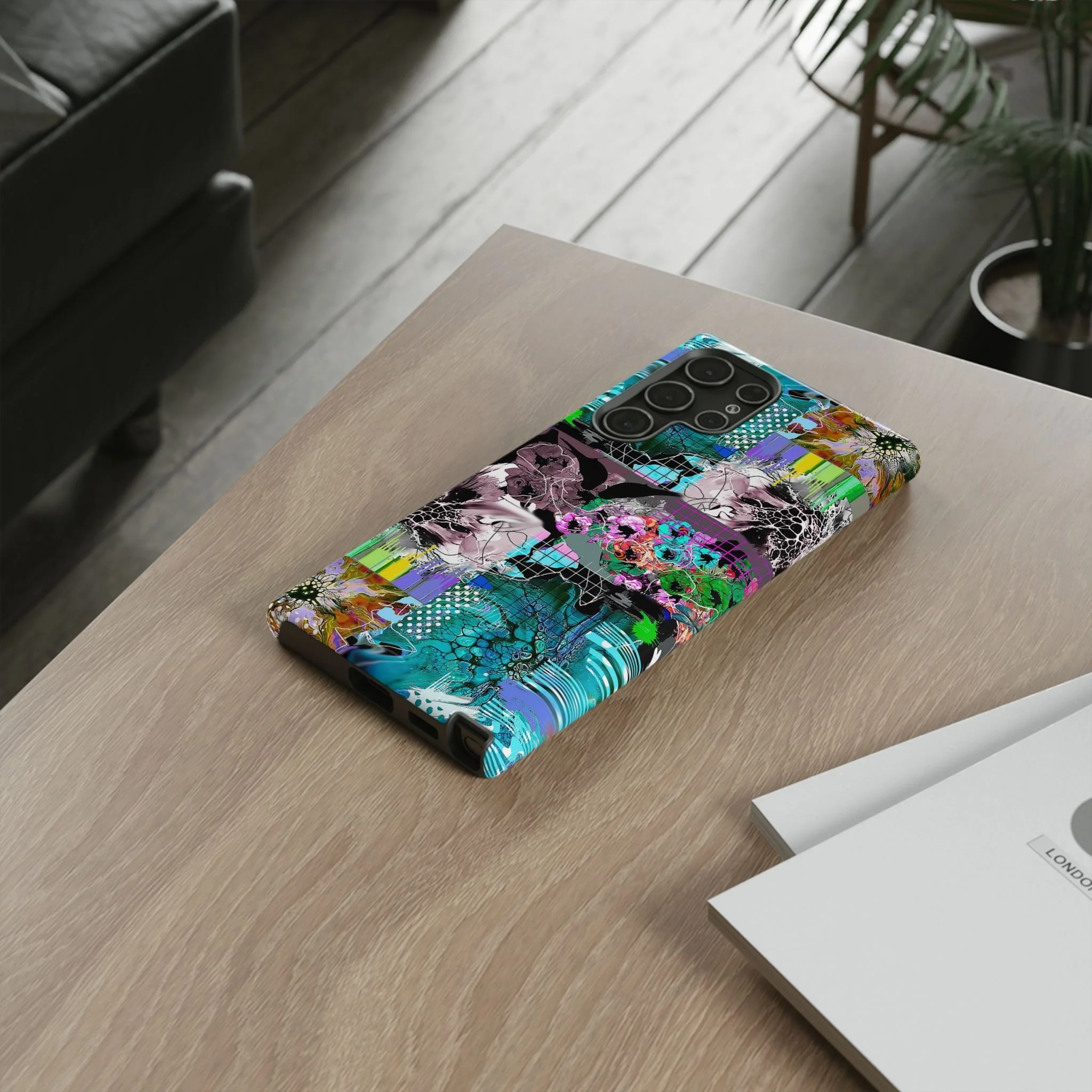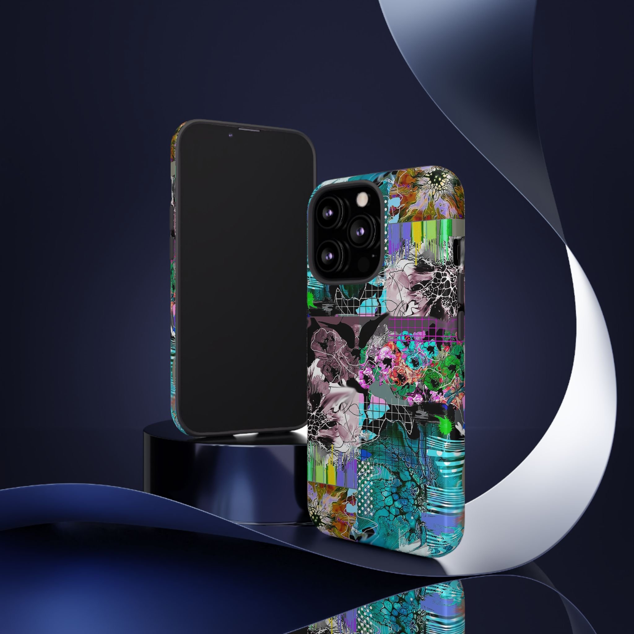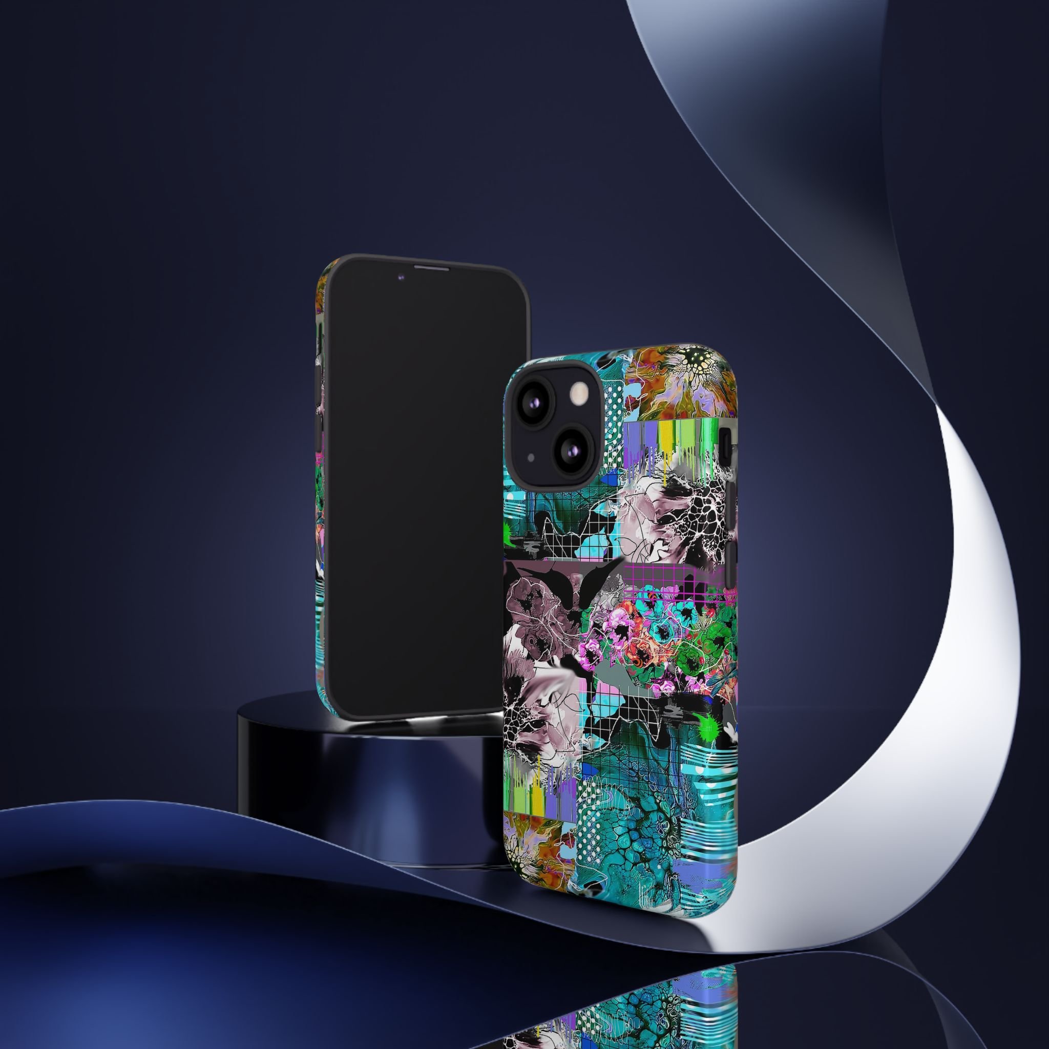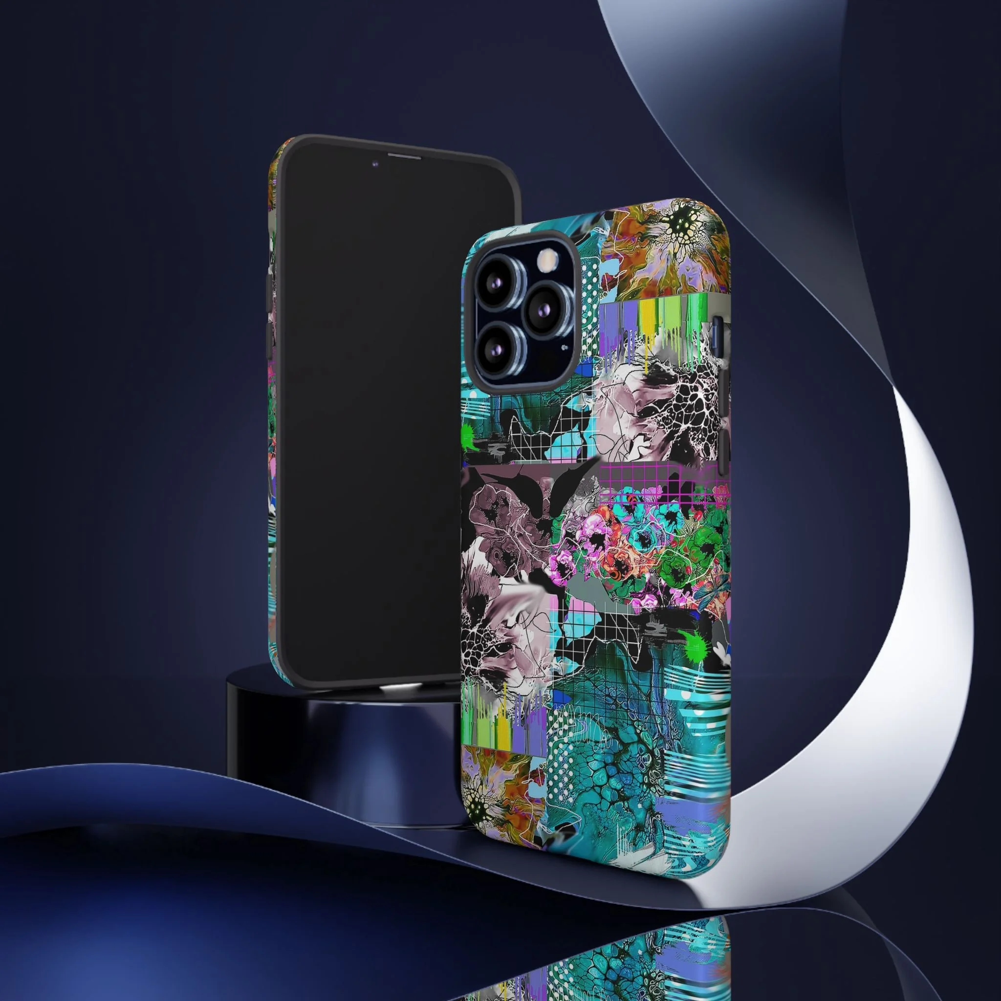 This vibrant digital artwork is a complex, layered composition featuring abstract floral and organic forms in a kaleidoscopic array of colors. Predominant teal, turquoise, and purple hues blend with bursts of green, pink, and yellow, creating a dynamic and visually explosive image. The artwork incorporates various textures, including honeycomb-like patterns, grid overlays, and fluid, organic shapes that seem to morph and flow across the canvas. Flower-like structures are distorted and reimagined through a digital lens, with some elements appearing crystalline or fractured, while others maintain a more painterly, soft-edged quality. The overall effect is a mesmerizing, almost psychedelic visual experience that blends digital art techniques with organic, natural inspiration.artwork bu John Ridlon