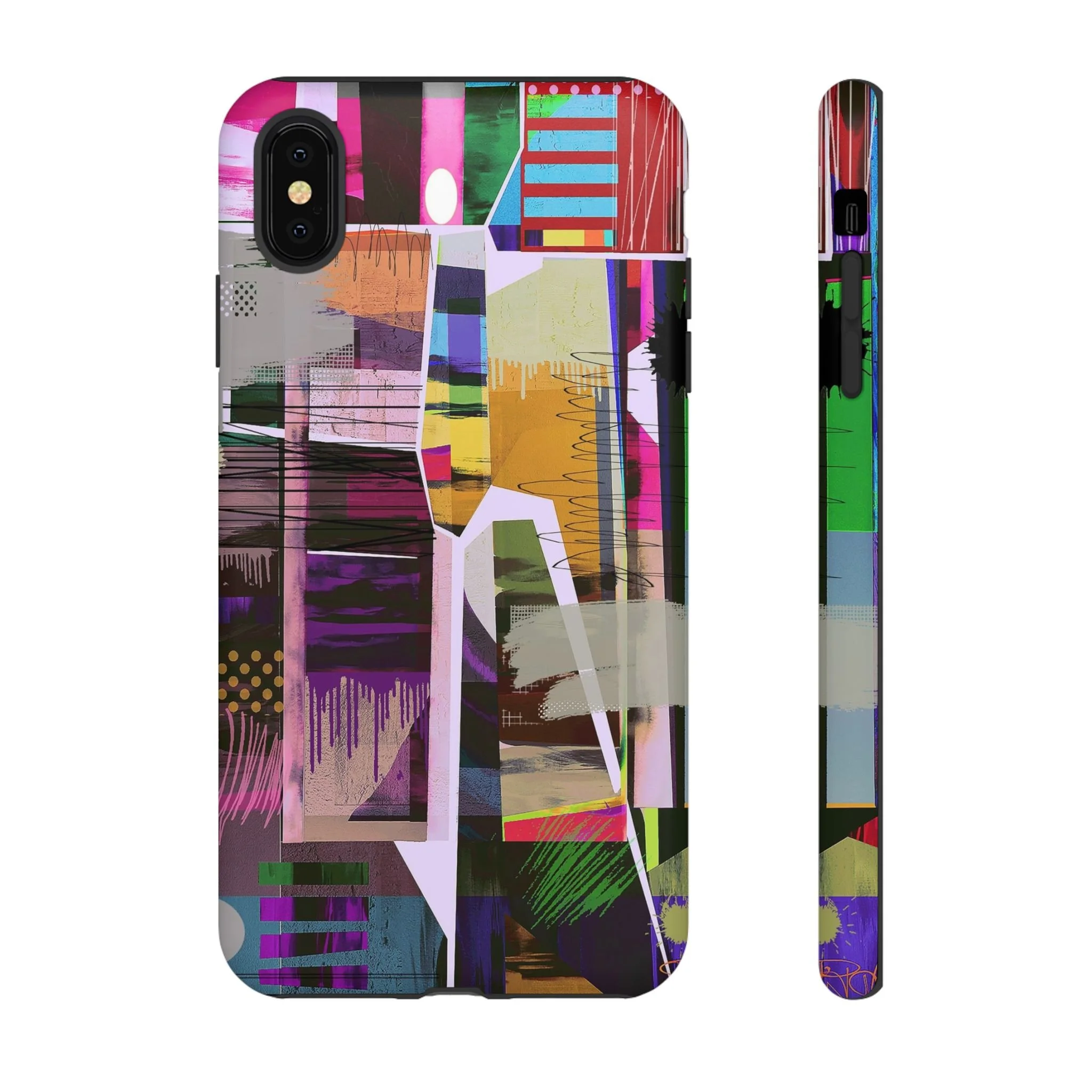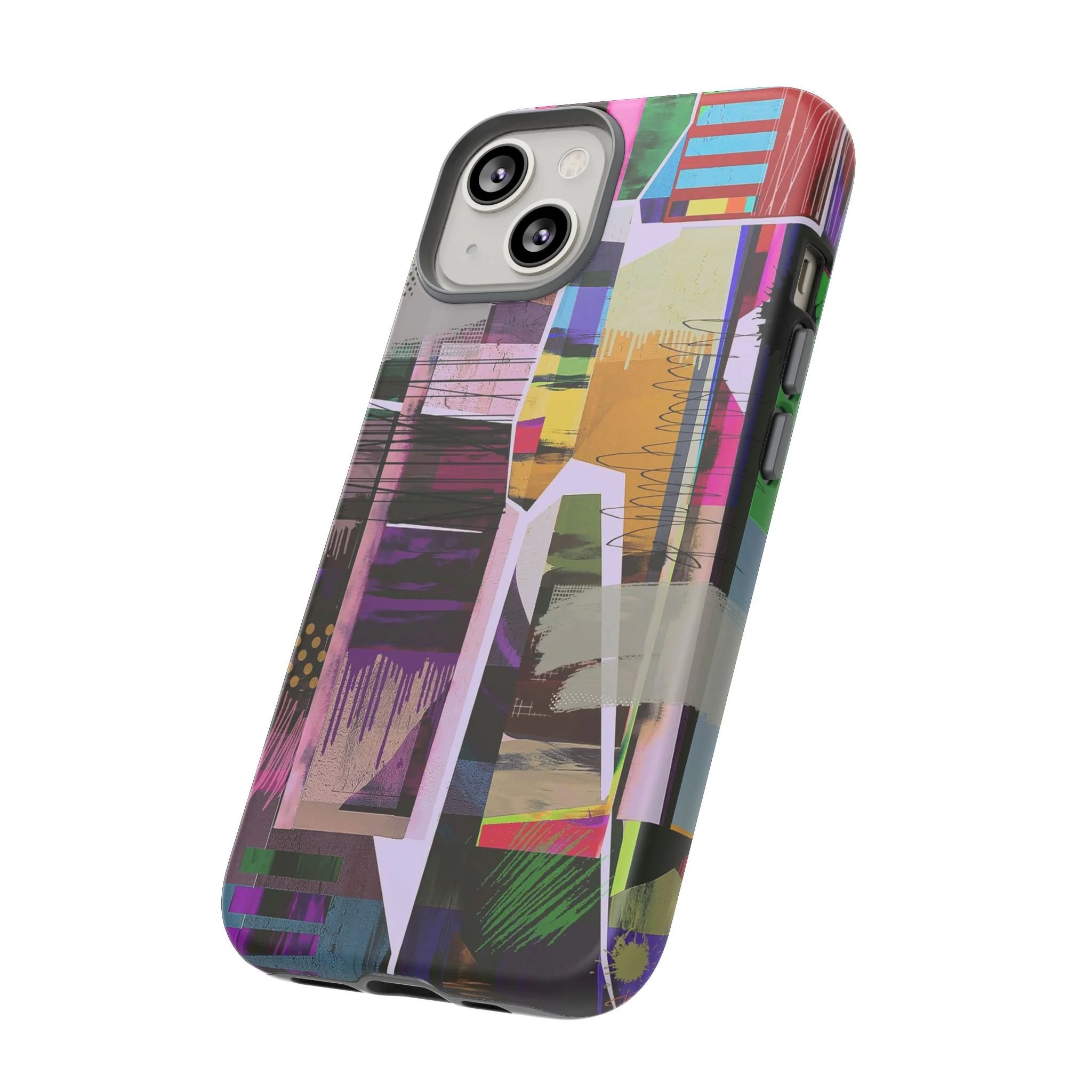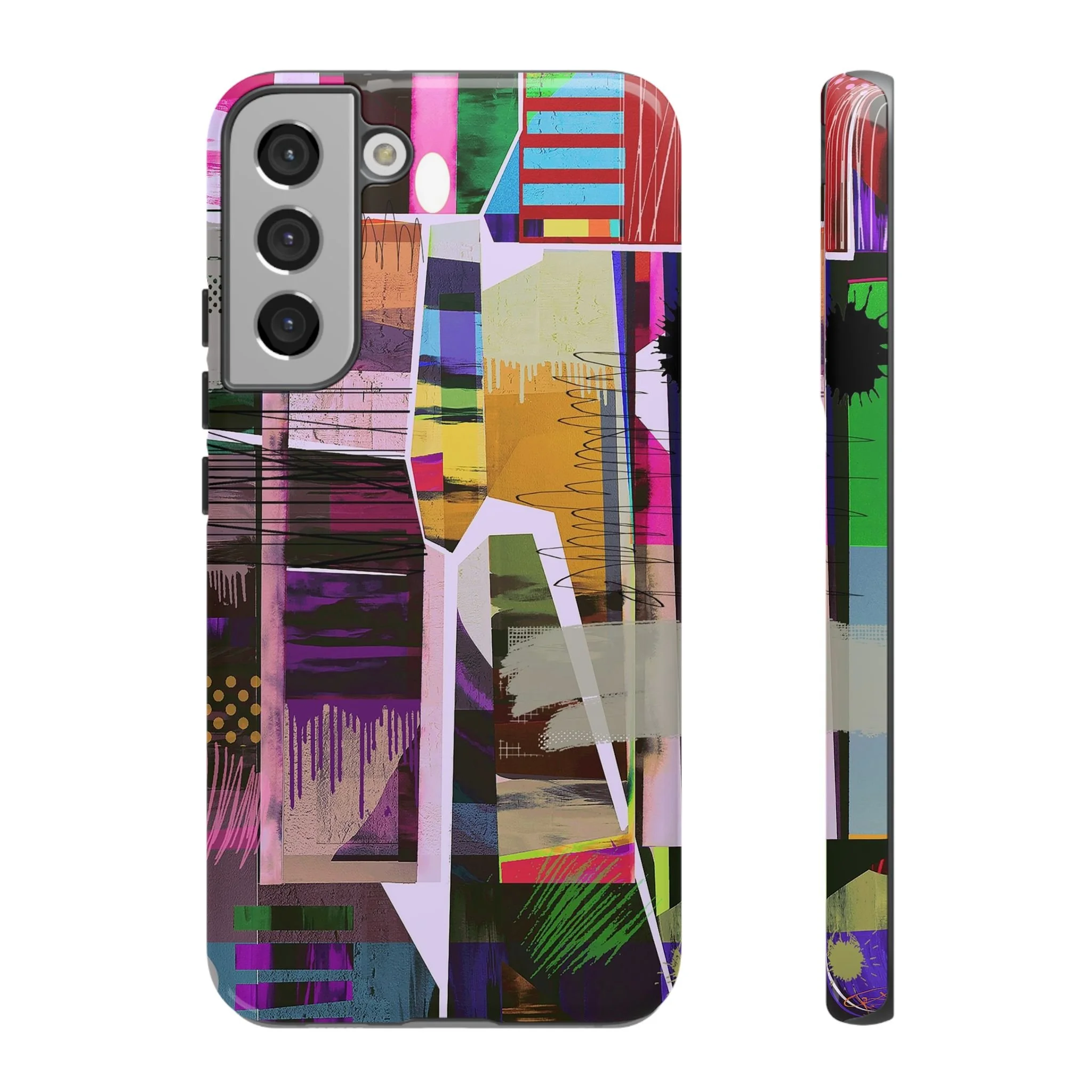 This vibrant abstract digital artwork is a complex collage of geometric shapes, color blocks, and layered textures that creates a dynamic visual composition. The image features a rich palette including pink, purple, green, blue, yellow, and red, with various patterns like polka dots, stripes, and painterly brushstrokes intersecting throughout the piece. Geometric shapes are fragmented and overlapping, creating a sense of depth and movement across the canvas, with drip-like paint effects and scattered splashes adding organic elements to the structured design. Textural elements include mesh-like overlays, crackled surfaces, and semi-transparent layers that allow glimpses of underlying colors and shapes to peek through. The artwork appears to blend digital manipulation techniques with a painterly aesthetic, resulting in a modern, energetic piece that explores the boundaries between digital and traditional art forms.artwork bu John Ridlon