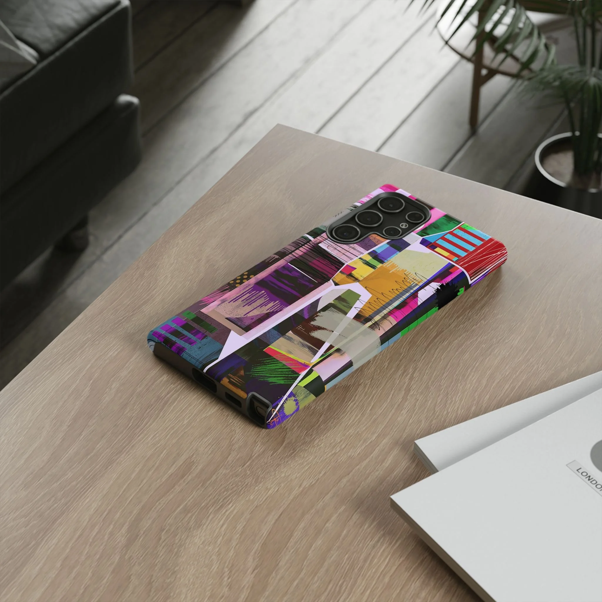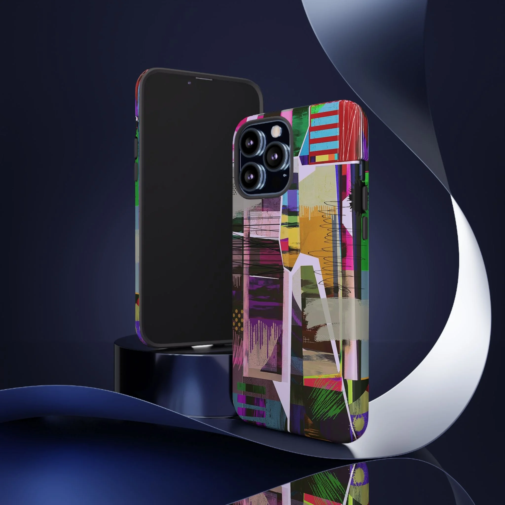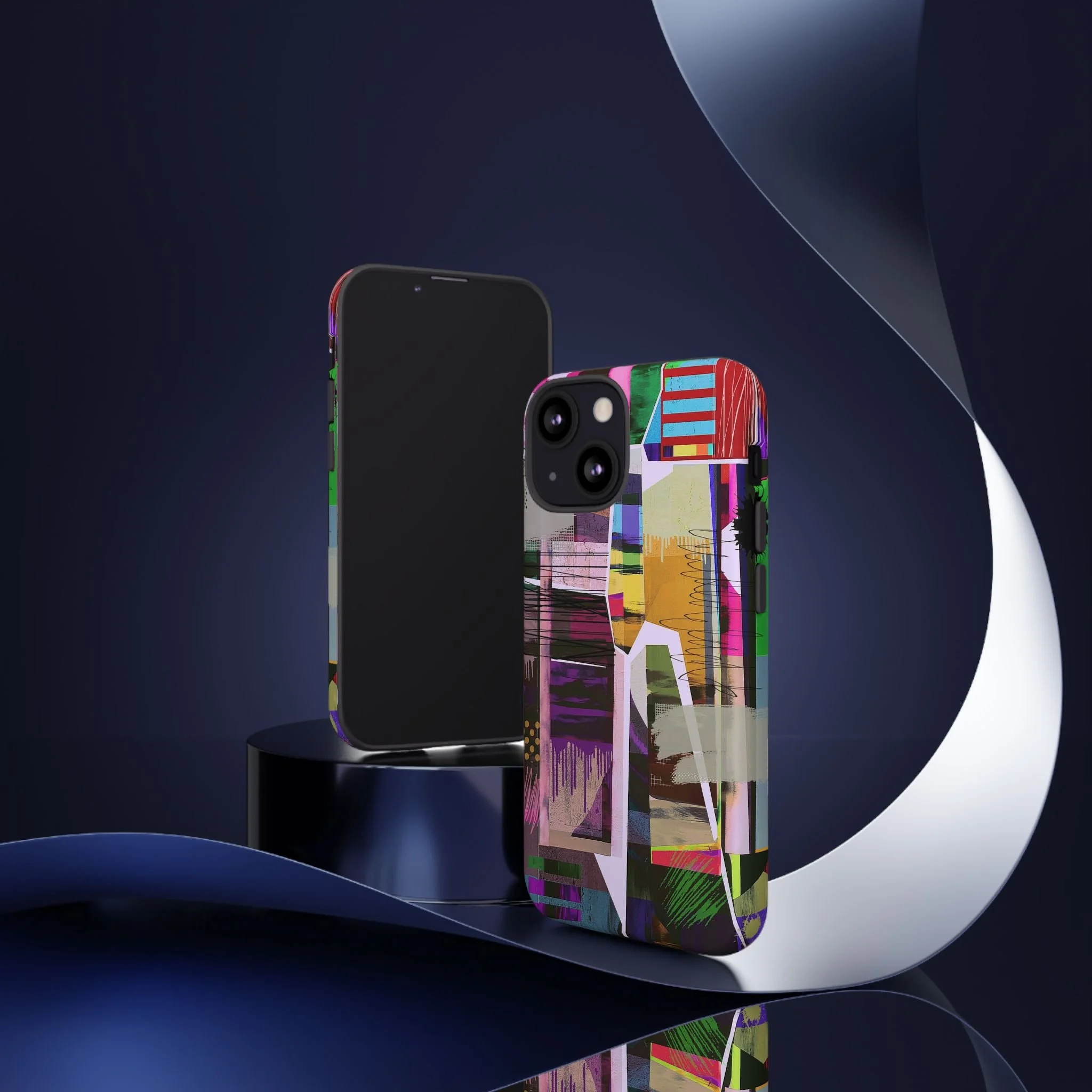 This vibrant abstract digital artwork is a complex collage of geometric shapes, color blocks, and layered textures that creates a dynamic visual composition. The image features a rich palette including pink, purple, green, blue, yellow, and red, with various patterns like polka dots, stripes, and painterly brushstrokes intersecting throughout the piece. Geometric shapes are fragmented and overlapping, creating a sense of depth and movement across the canvas, with drip-like paint effects and scattered splashes adding organic elements to the structured design. Textural elements include mesh-like overlays, crackled surfaces, and semi-transparent layers that allow glimpses of underlying colors and shapes to peek through. The artwork appears to blend digital manipulation techniques with a painterly aesthetic, resulting in a modern, energetic piece that explores the boundaries between digital and traditional art forms.artwork bu John Ridlon